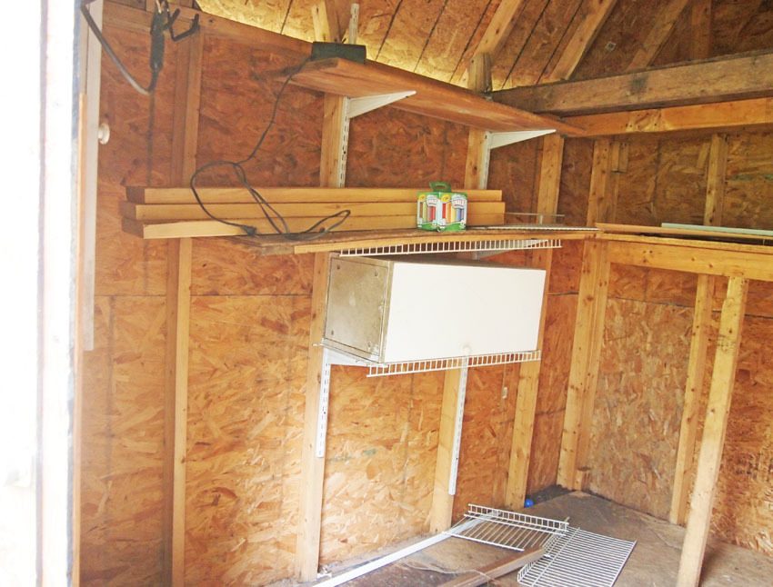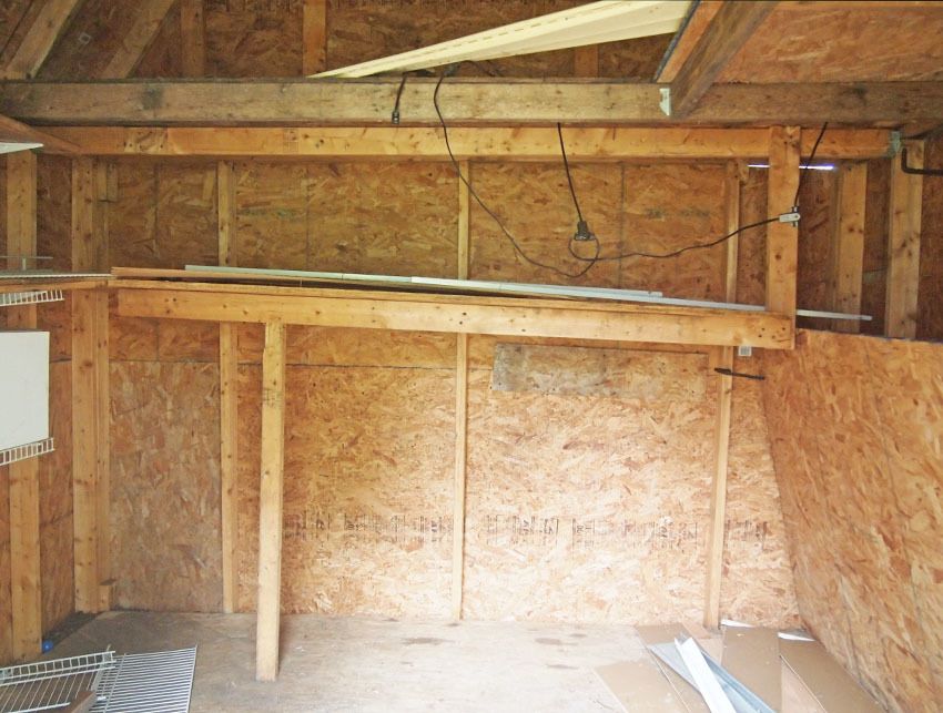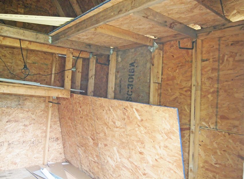 Left side: White shelving is coming down. Window in middle, where shelving is. Pop door will go on this side as well. Might put window farther forward if it will fit between beams. (east facing) You can sort of see the ventilation under the eaves.