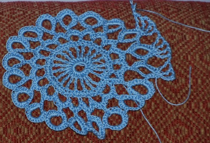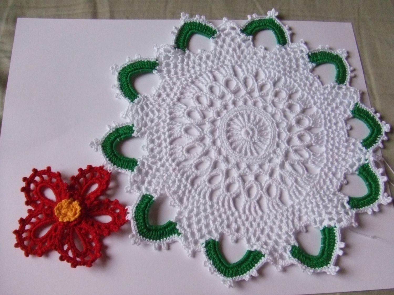 I have decided to go with the red. I like it well enough to use during the holidays. I will continue on each night until I get it done. Will show more pictures when I get a few more m motifs on. How are you all coming along on yours?I like it! Great for the holidays! I have to make this comment. The pattern is not that well written. I am finding my work is coming our ruffly. It should lay flat. I am pretty sure it is not my crocheting since I have made two of centers. The flowers are also too full. They are going to require a lot of starch. Something I do not use on my flat doilies. It could be just me.