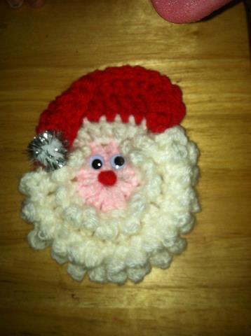 Here is the Santa ornament I made today it is easy and pretty quick, I used a size G hook but I crochet pretty tight. Pattern(free) can be found here http://cakesbykristin.blogspot.com/2011/12/crochet-santa-face.html Please forgive my Daughters tongue at the top of the picture!!! LOL I did not know she did that till I posted the pic![]()