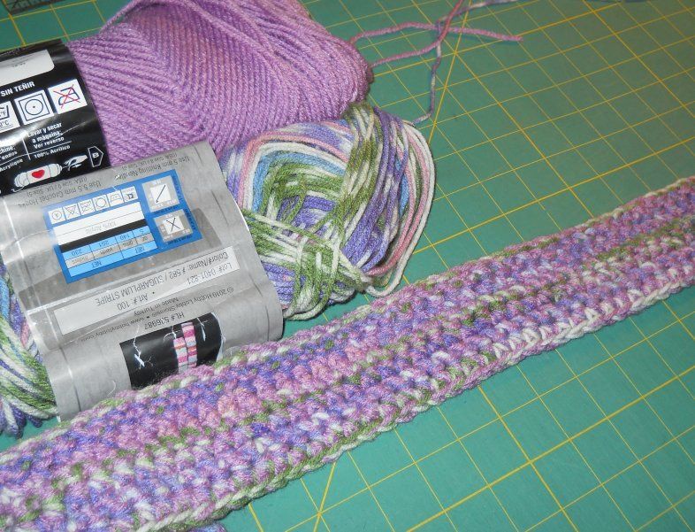 These scarves are made using two yarns at once on the hook. First one was the "all wrong" one. Second one in progress.