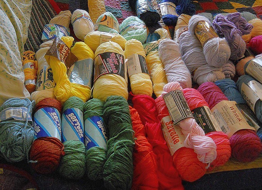 Some is really old Red Heart, some Wintuck, Natura from Caron, some brands I'd never heard of like Sandra Unger and Pingouin Artifice, some very old labels on it, etc, etc.Gosh, one even had a Woolworth's label on it and one had a Zayre's label, if you can remember them! I bought the entire bag for just $15! Some was a bit musty from being stored, but just needs to air out, some full skeins, some partials, all kinds of colors, mostly basic acrylic, but some is of a pricier nature. Every color you can imagine is in there, I'd say, and probably 50 full skeins and numerous partials and little balls of miscellaneous stuff.