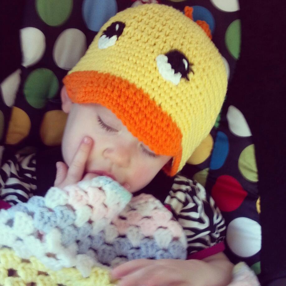 Spring chick hat I just finished for an Easter photo shoot. It is hard to tell, but the eyes are accented in brown.