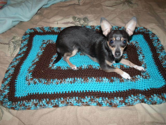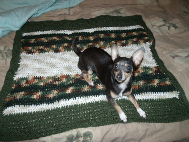 Cute blankets cute dog!!! Yep I was wondering LOL.My mother made these couple things. Baby blankets have become her favorite because they're quick and she can practice stitches. The dog thinks ANYTHING yarny is hers and won't let any other animal near it if she's 'got' it. She doesn't hardly shed but Everything gets washed with 'free' detergent before donating.