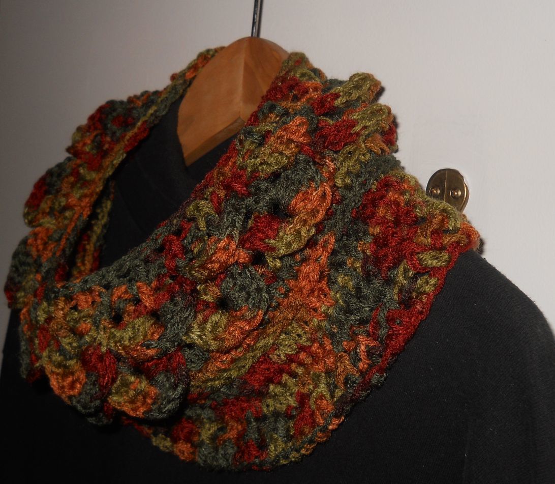 This started as a cowl-had already made one using the crocodile stitch but the yarn wasn't as soft as I wanted so started a new one and for some reason, the neck area isn't as stretchy as the first one, not enough for me to get it over my own fat head, which made me realize that I had made an interesting hat! I put it up for sale on our new website (check it out and sign the guestbook, everyone!) www.blueroocreations.com. There's a blog and a farm sales page, etc, and other crafts besides crochet.