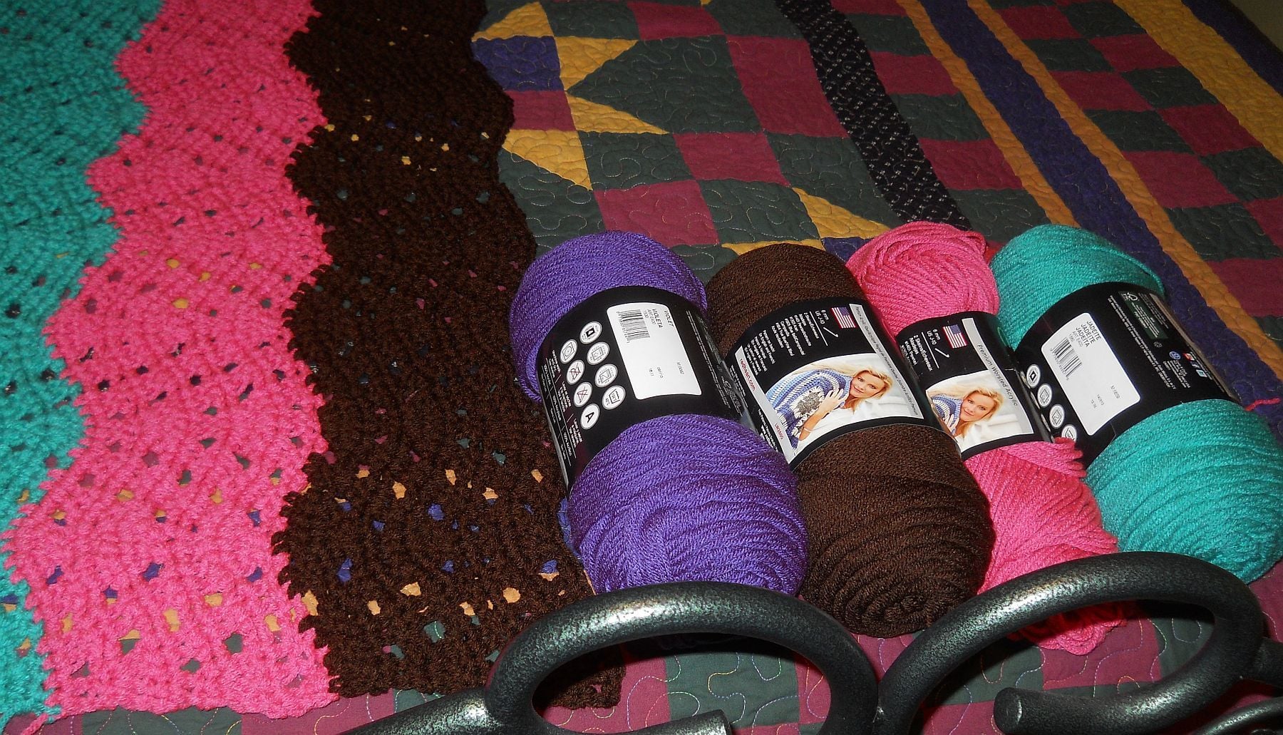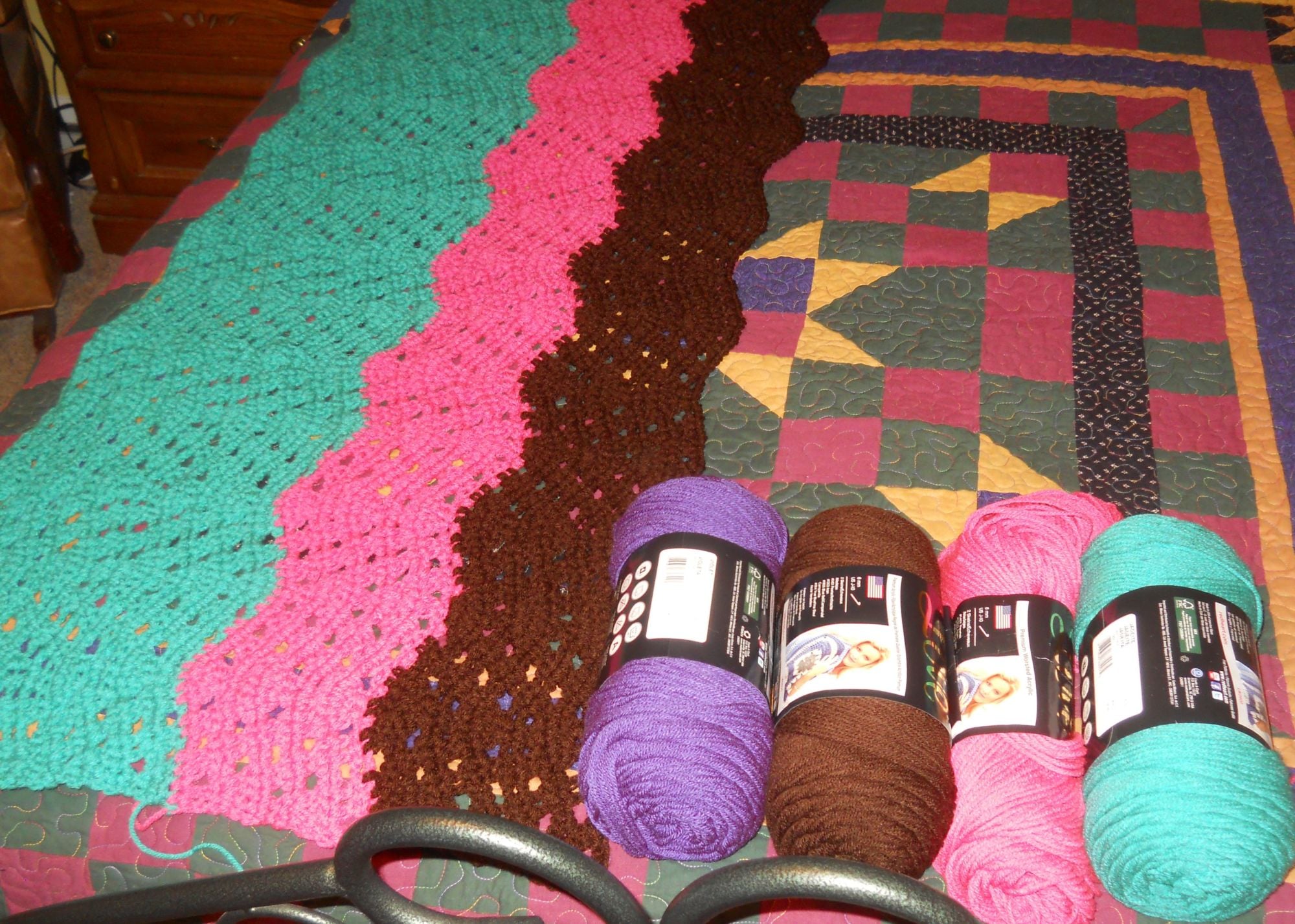 Beautiful!! I love the colors.They used to be very, very strict about any forum links at all, no matter what type, so you may still see a note from the staff or something. I'm not in the loop anymore about that so not sure if they've relaxed the rules somewhat or not. I have decided on the course my afghan will take. Here it is, ready for the middle section, which will be the violet, so the skeins are lined up in the order in which they'll go in the afghan. Hope I have enough to make it long enough for the width of it! Its so much wider than it was supposed to be.![]()