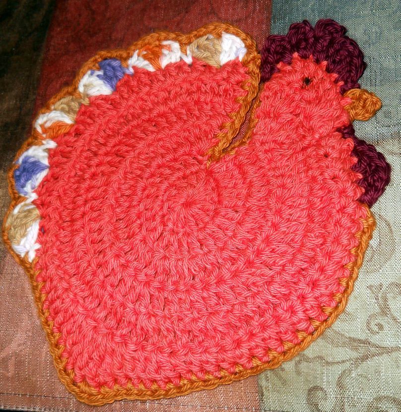 Oh wow...there is a crochet thread on BYC? How nice! Hi I'm Peggy....and I also crochet. Just started an "E Pattern" for a chicken potholder last night. I haven't made anything other than baby hats in a couple years, but i have several afghans going that I need to get back to. No time for big stuff with a toddler to look after. Anyway, this is the pattern I am working on, from an Annie's Attic book called "whimsical Potholders" . Meet Henrietta the chicken. From the pattern book