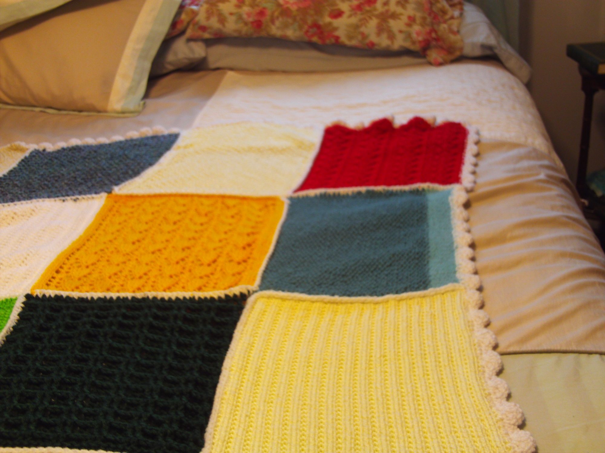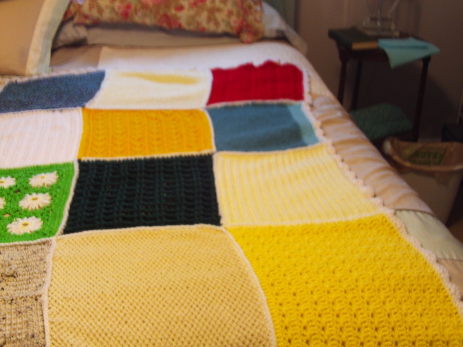 She like to lay it out and hop from squares to square. It's made from different yarns and patterns. Some knit some crochet. In the beginning the woman who started it had us all buy the same type yarn, which was nice. Some of the ladies, (I'm the only guy) whined it was too expensive and "I can't afford that" . Which is a crock, IMO. They only had to do one square for heavens sake!