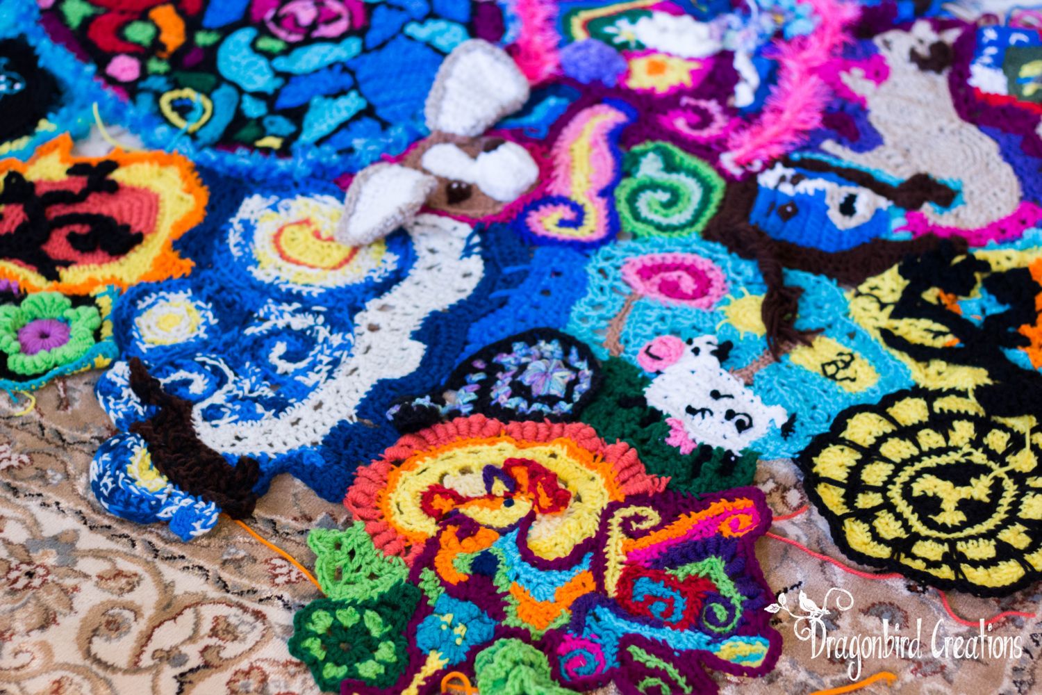 This is great! Can you post a pic of the whole thing!?My latest crochet adventure is finishing up this freeform blanket-I put it down a little more than a year ago-I was getting a little overwhelmed with all the ends I would have to weave in (after just coming off a different freeform blanket this was not appealing to me)....in the year it sat in hibernation I started my little flock, and will be getting some more chicks in March-my latest piece to the blanket incorporates the rooster of my imagination.![]()