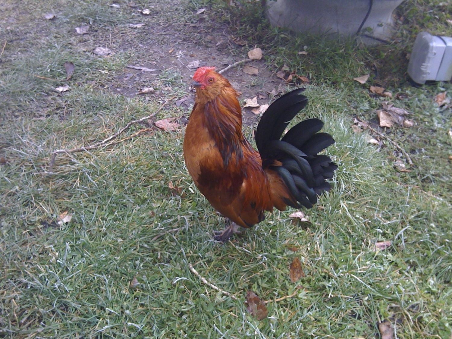 I had a purebred mille fleur d'uccle cockerel that was hatched on March 1,2012. Here is a picture of him on April 6 2012 with his co-moms (neither of whom was his biological mom):