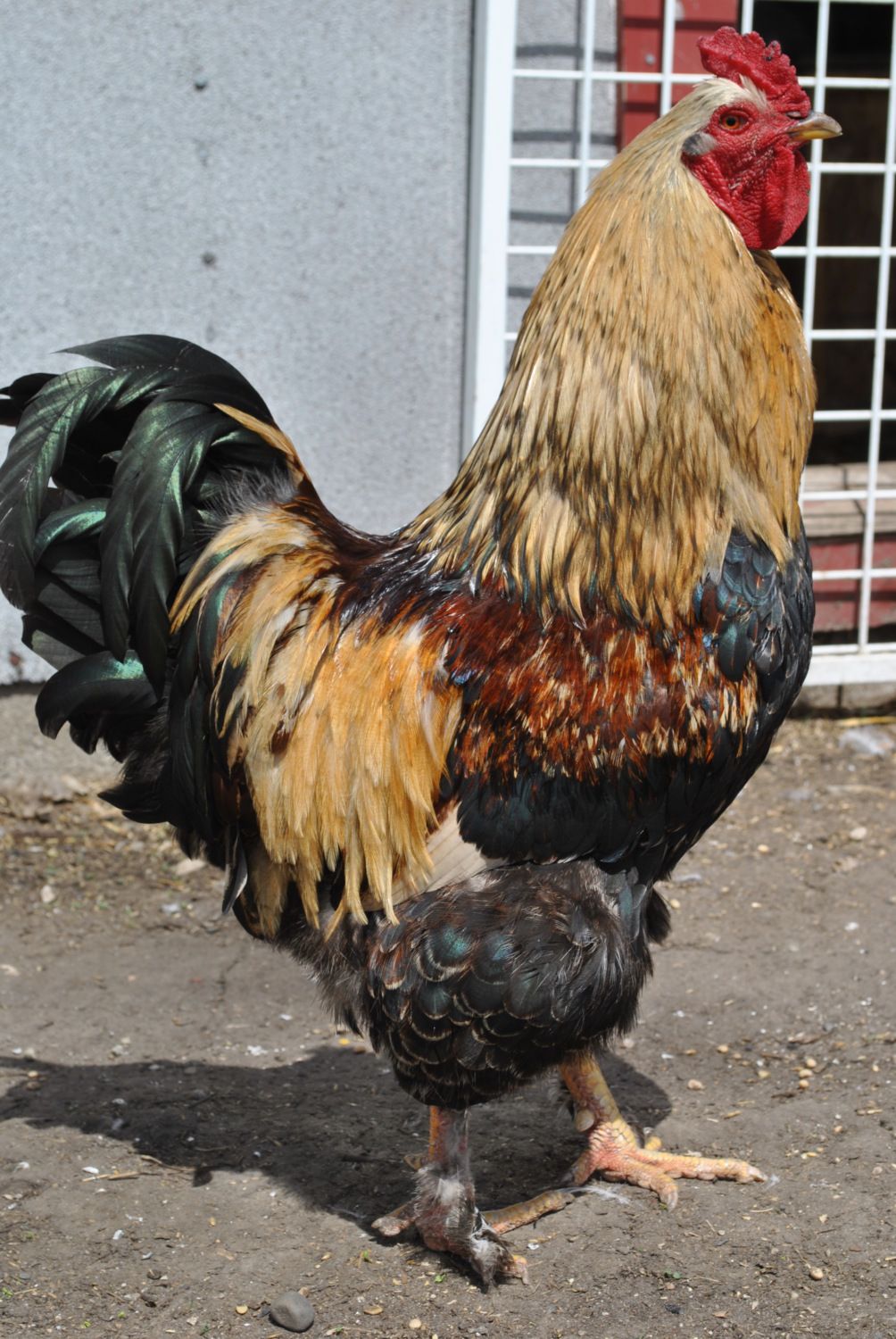 Thanks.  I am a bit sad because he has gotten so large that my 3 daughters are getting a little nervous around him.  I think I need to get rid of him, but he is so pretty.  His daddy was big pure Buckeye and mama was a white Cochin.  So far he is not aggressive, just large and in charge!