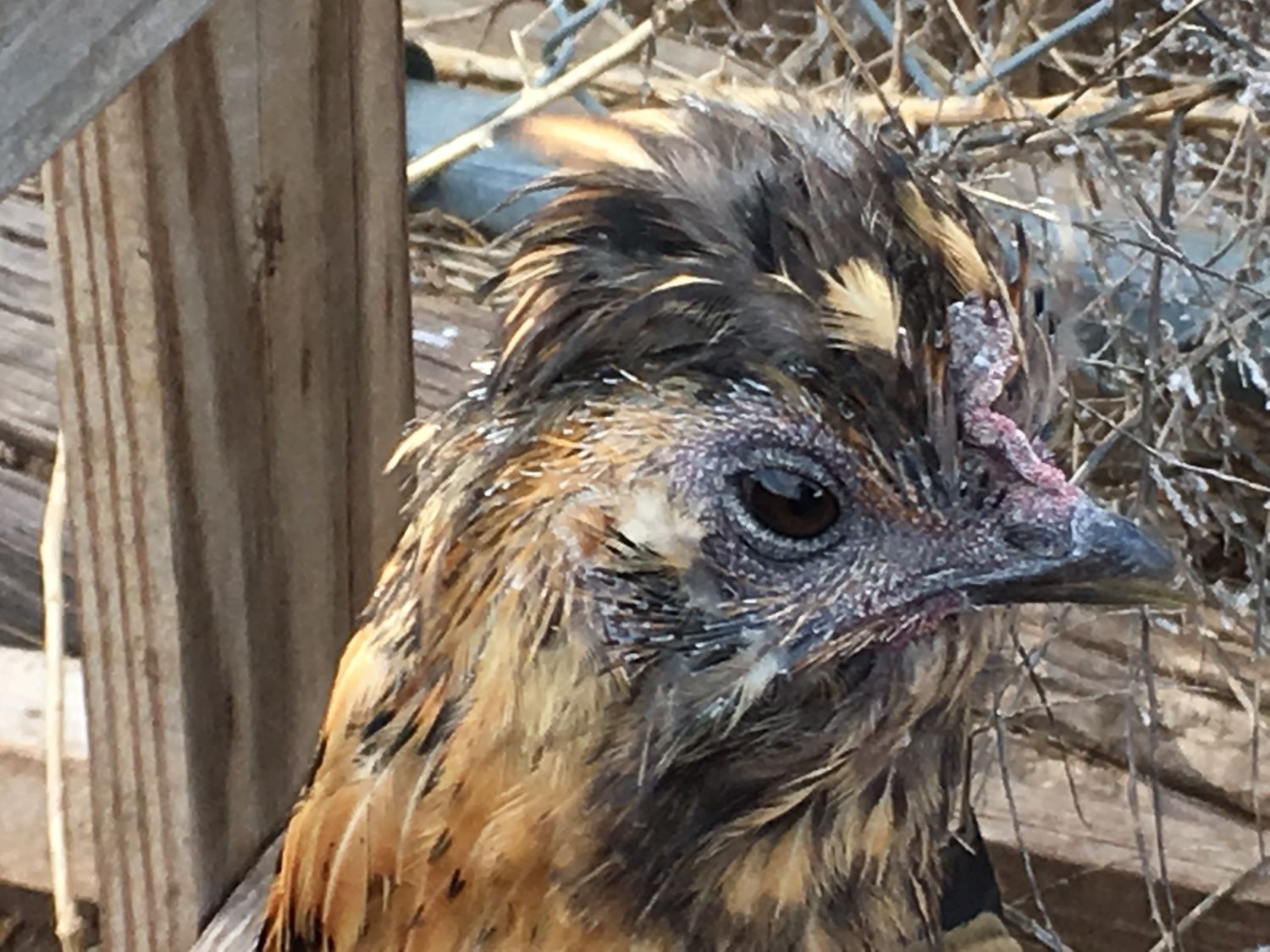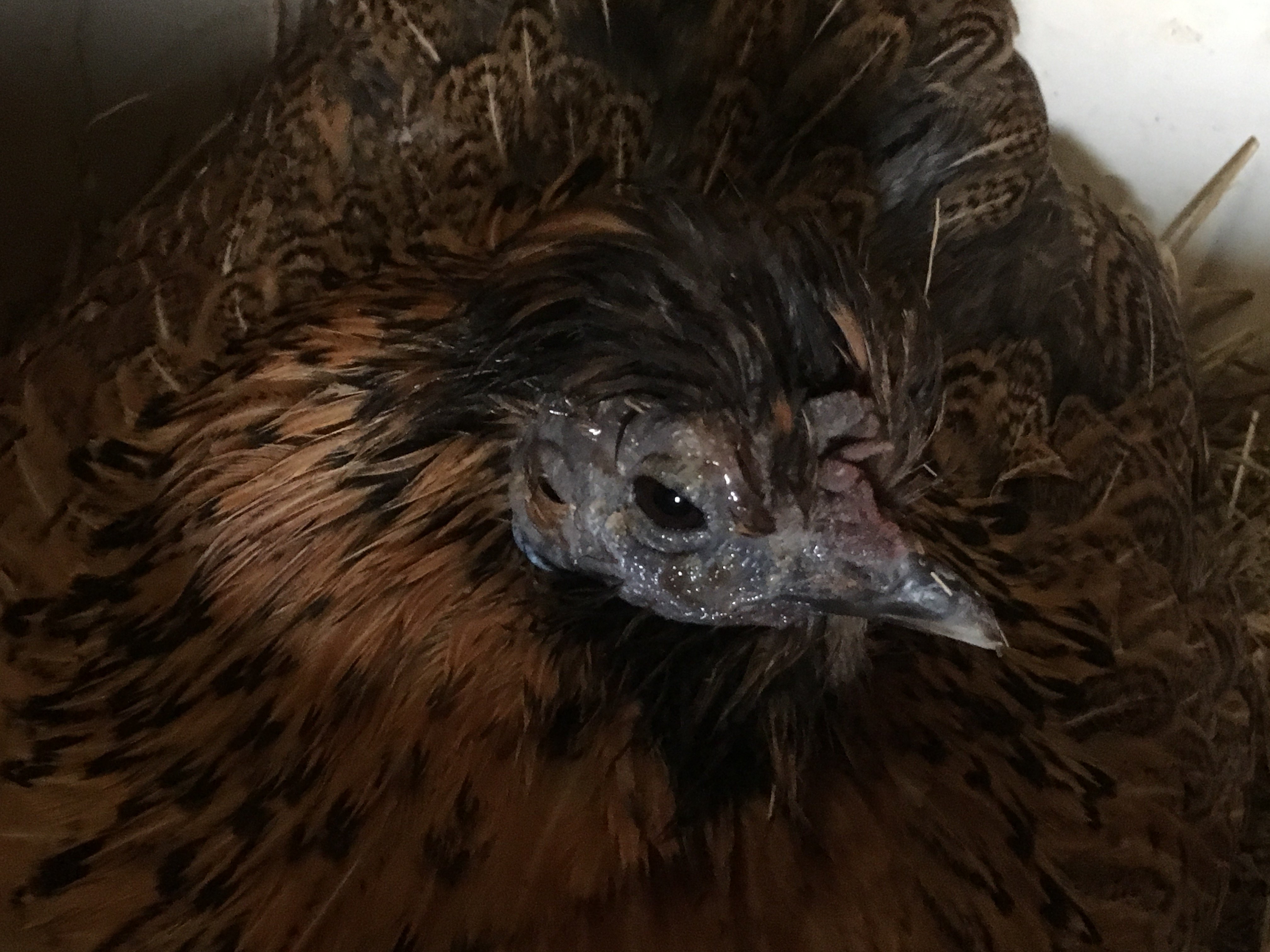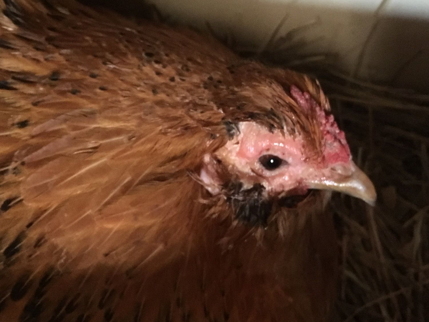 This is 'baby girl' - a 1.5 year old bantam that we adore. She is quite broody and I've been letting her sit on a nest with eggs recently. When I checked on her tonight her right eye was closed and the skin around both eyes as well as her comb looked crusty and dry. Any ideas about what this could be and best treatment?