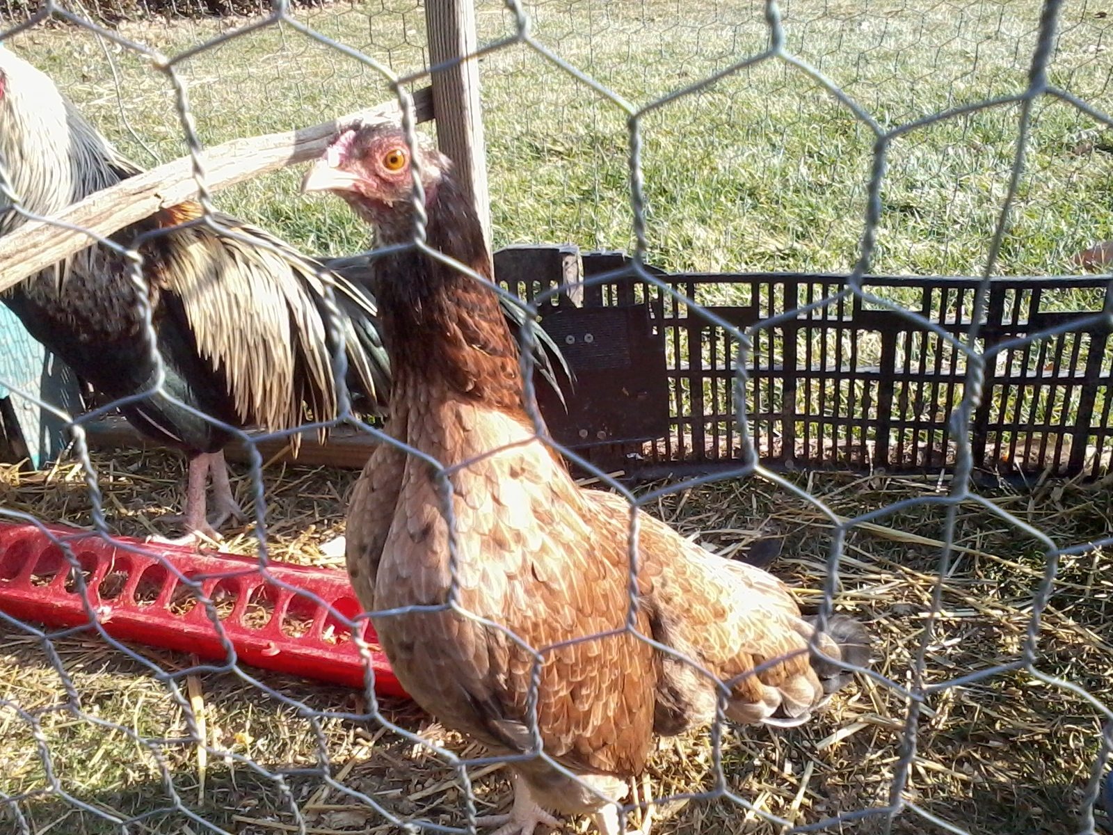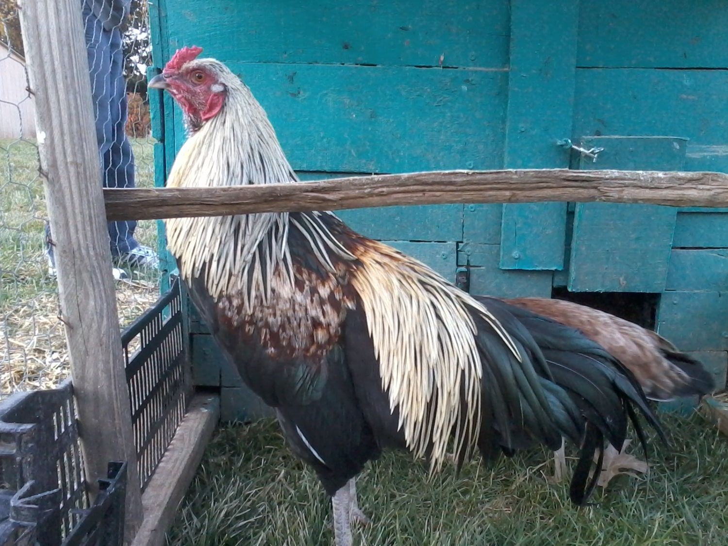 The white rooster is from a trio I bought from cubalaya last summer, a white pair with a wheaten hen. Very nice birds. The whites are a little small, but the wheaten hen has turned out gorgeous. She weighs as much as the rooster and her tail is very long and full.