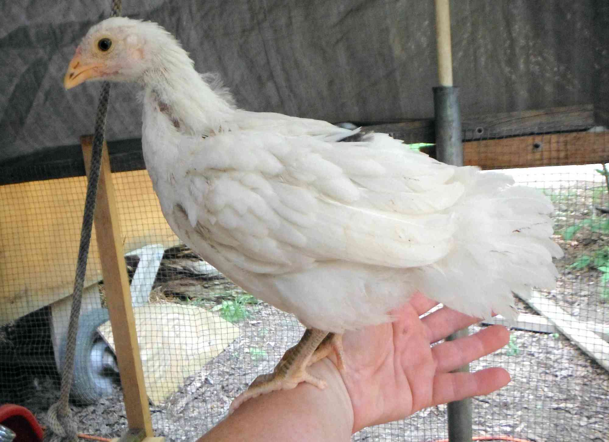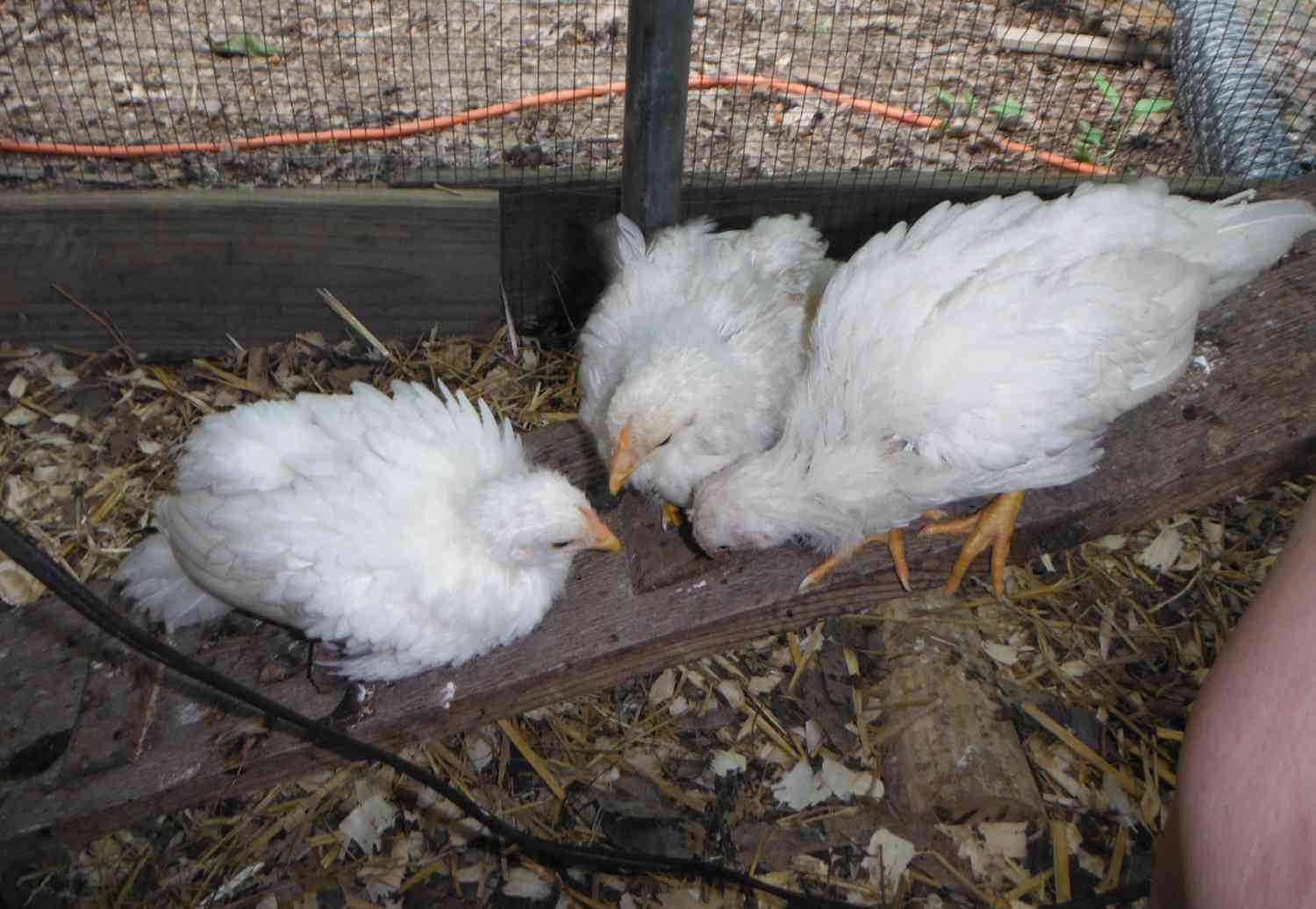 Those white chicks look nice. Maybe it's just the picture, but they all seem to have yellow legs? I find that my whites will produce a lot of yellow legged offspring. They ought to have white legs of course, by this age if they were going to be white, they would be. There is and are more important things than leg color, of course. If they are exceptional otherwise, they could be kept and bred back to a good white legged mate. Just want to point this out because if you breed two with yellow legs together you will get all yellow legged chicks. If they do have yellow legs, cross back to white.