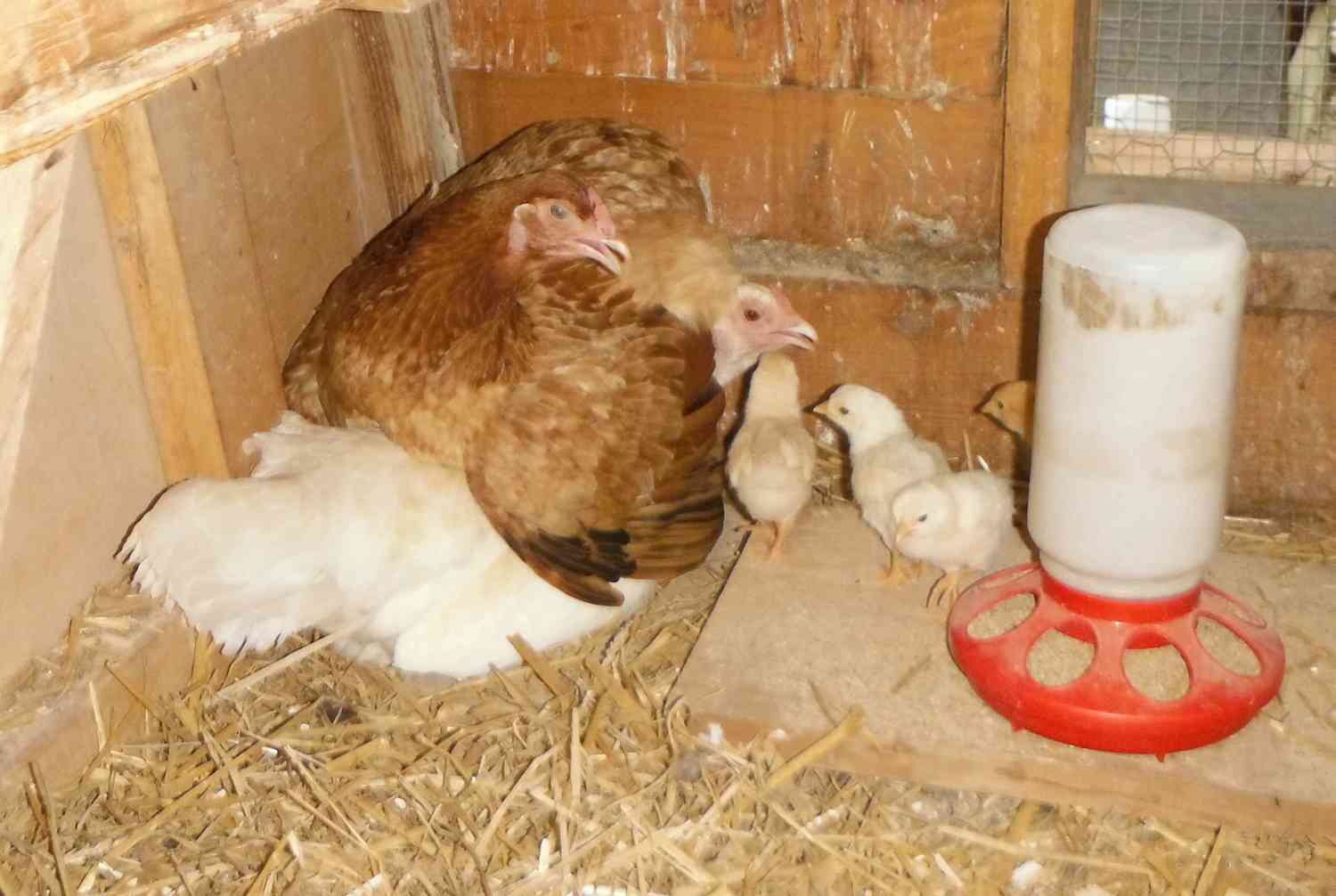 Here they are trying to settle down for the night. The dominant hen is the white one. The wheaten usually winds up spreading over the top of everyone.