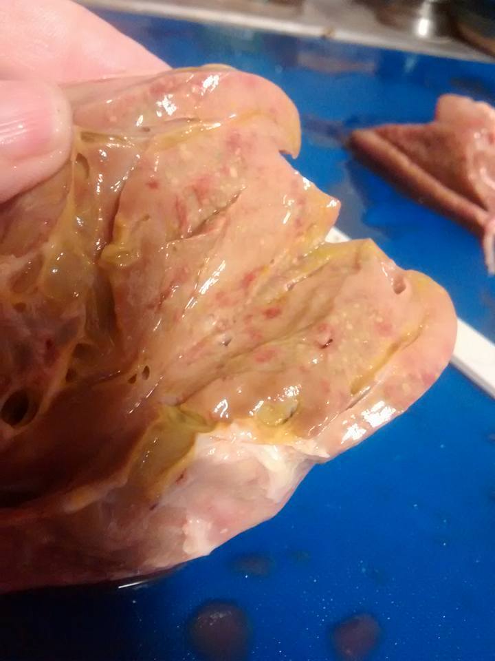 This is the inside of the liver after I'd cut into the center. What should be glossy, smooth, floppy and red ... isn't.