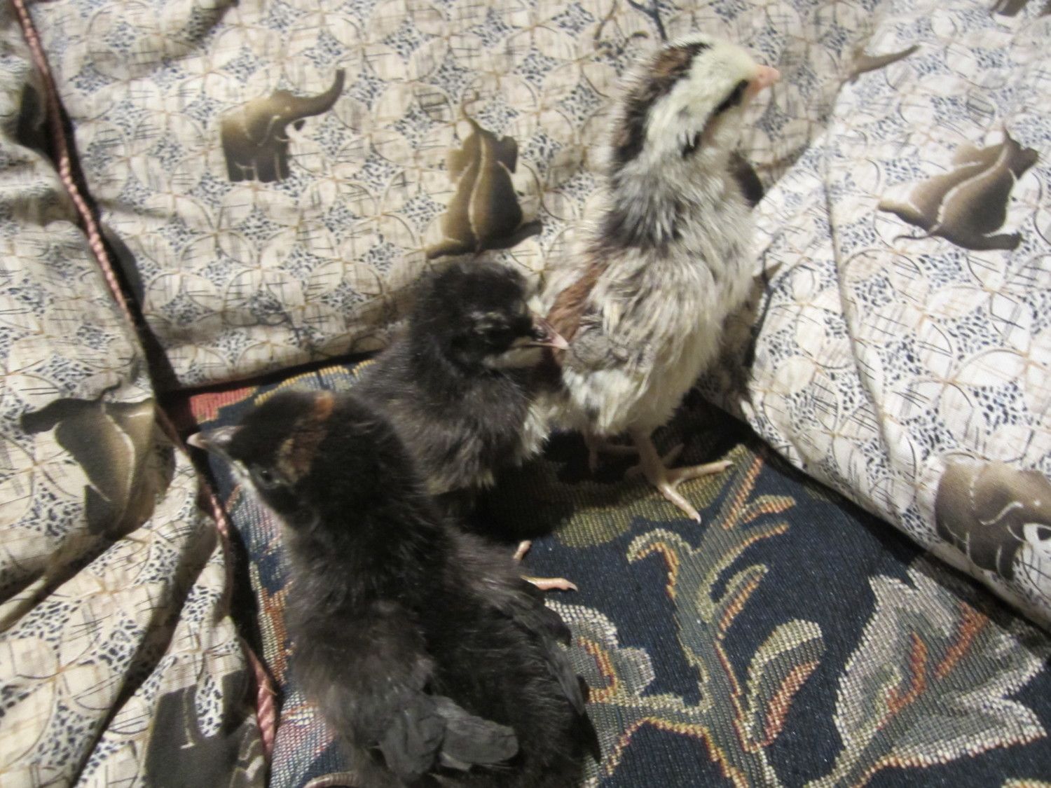 I drove 3 hrs round trip to get 2 more Icelandic chicks today. Izzy is in front, Isabelle the other black chick and Isis the striped chick.