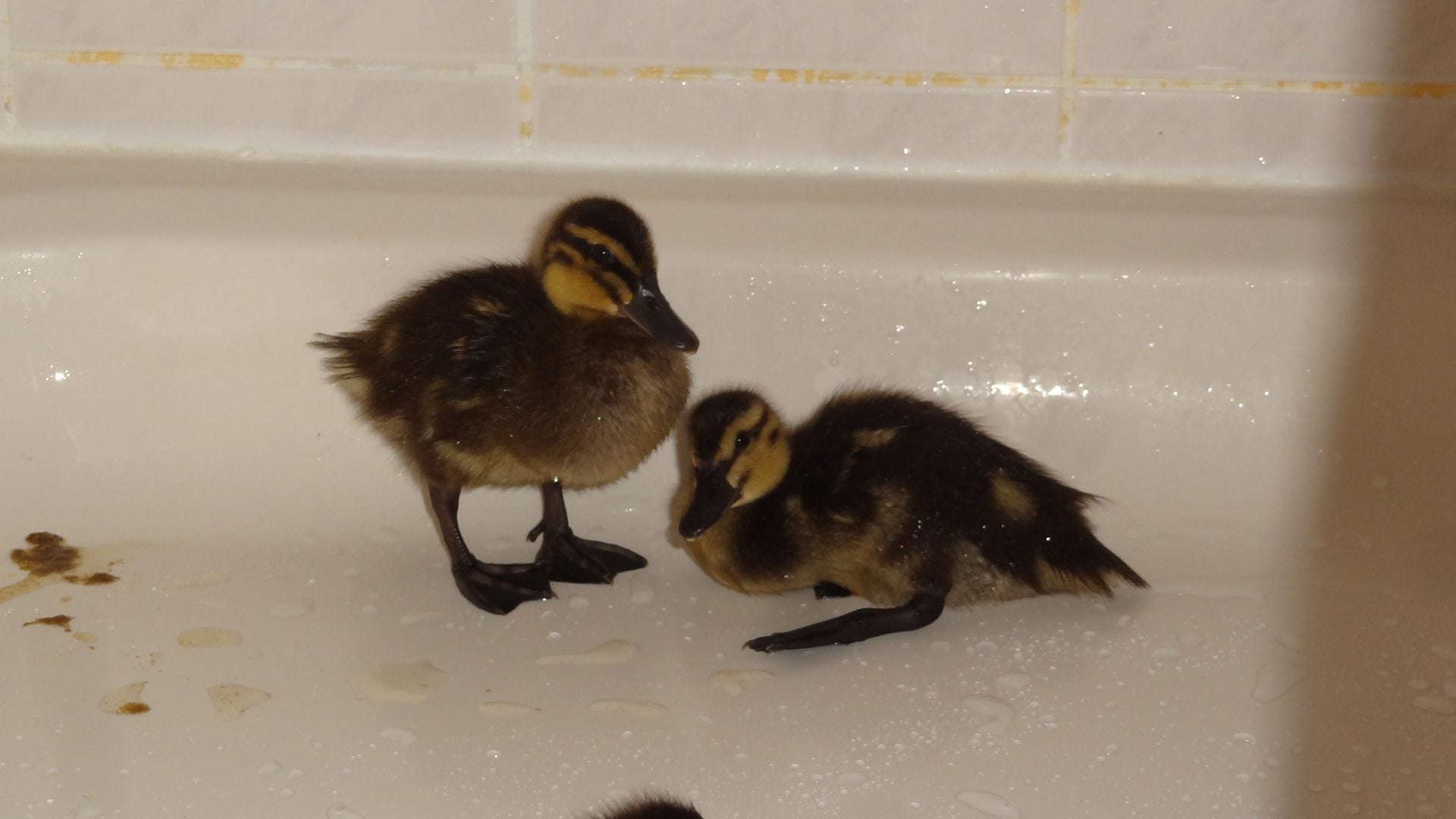about: They are really scared of people, especially the little one/Mini Me. They see Winnie as their big brother/sister and the three of them are now outside in the duckling day care, a pen with a pool. YAY diving! Zorro and her husband visit them and so do their aunts and uncle!