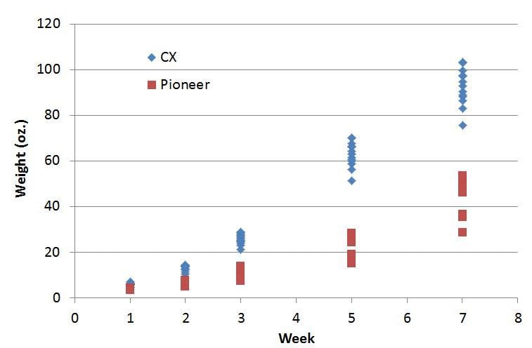 Growth trajectory for week 7. Meyer Hatchery suggests an average weight of 5.4 lbs by week 7, but my Cx have a mean weight of 92 oz (5.75 lbs). This is with restricted feeding and more exercise than any tractor would give them. They appear to be very healthy and alert tanks! Every one of them climbs down the ramp in the morning and up the ramp at night (along with foraging in the pasture during the day). Mean weight of the Pioneer is 44 oz (2.75 lbs). Though it is recommended for them to be processed at 9 to 12 weeks, I think it will be closer to 12 weeks at their current growth rates. We'll see what the future brings!