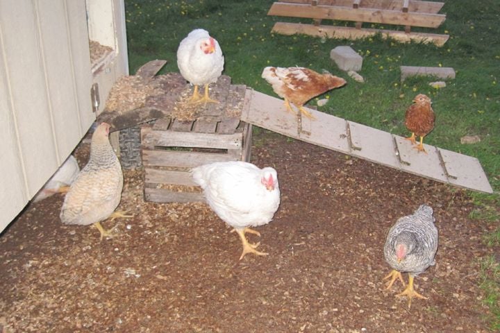All chicks outside the coop at week 7. On first glance, the Cx and Pioneer seem similarly sized. The Pioneer are actually a bit taller and about the same length. Once you pick them up, the difference is obvious. The two birds on the ramp are red sex links, which are half the size of the pioneer (by weight).