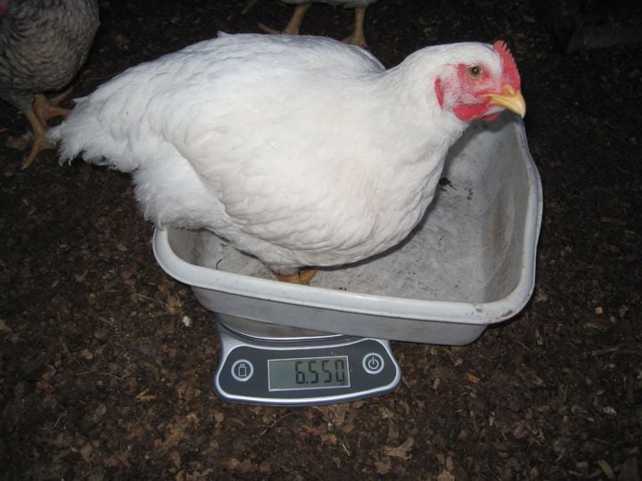 This is the big bird - 6.5 lbs (104 oz) at week 7. It was running everywhere today with no signs of distress at all. Ranging these birds is a fantastic way to do it since they get exercise, which keeps them healthy (along with restricted feed).