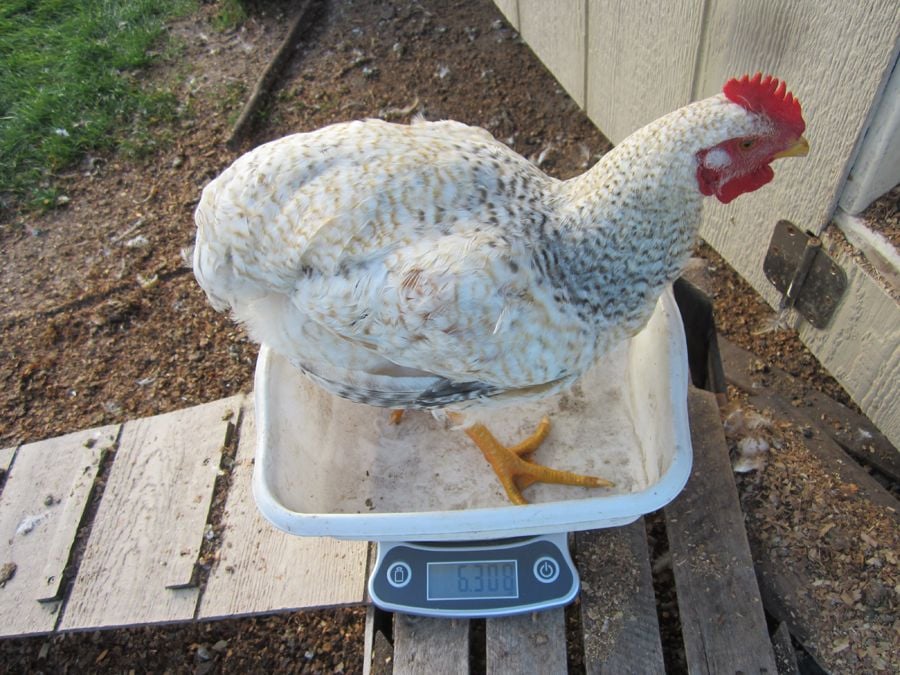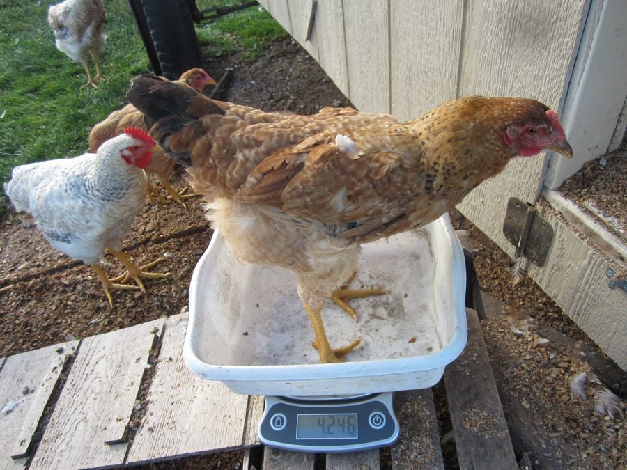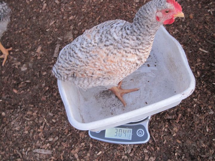At just over 3 lbs (49 oz), this was a slightly larger than average Pioneer. The birds are all healthy - very active, nice comb and waddle color, clear eyes. Really cool coloration and variety as well.