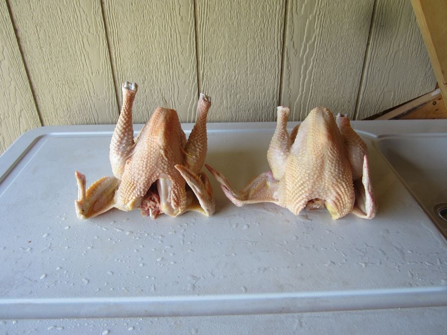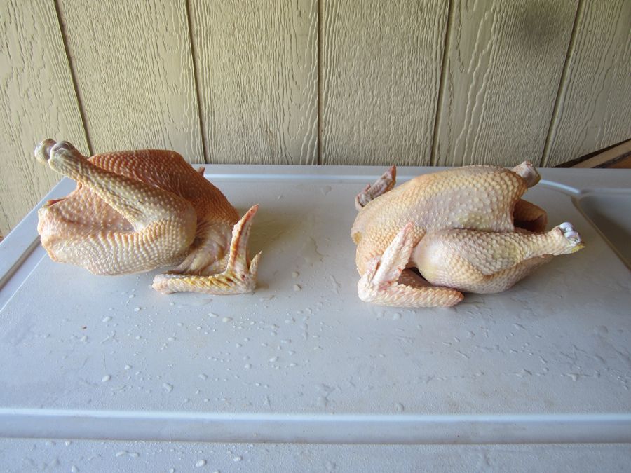 Side-by-side, the pioneer is on the left and the Cx on the right. Please remember that this Cx is about 2/3 the size of the Cx I processed previously. So, size can be deceiving between the two birds. However, their shapes were consistent. The Cx is shorter, with shorter legs. Much larger breasts and drumsticks.