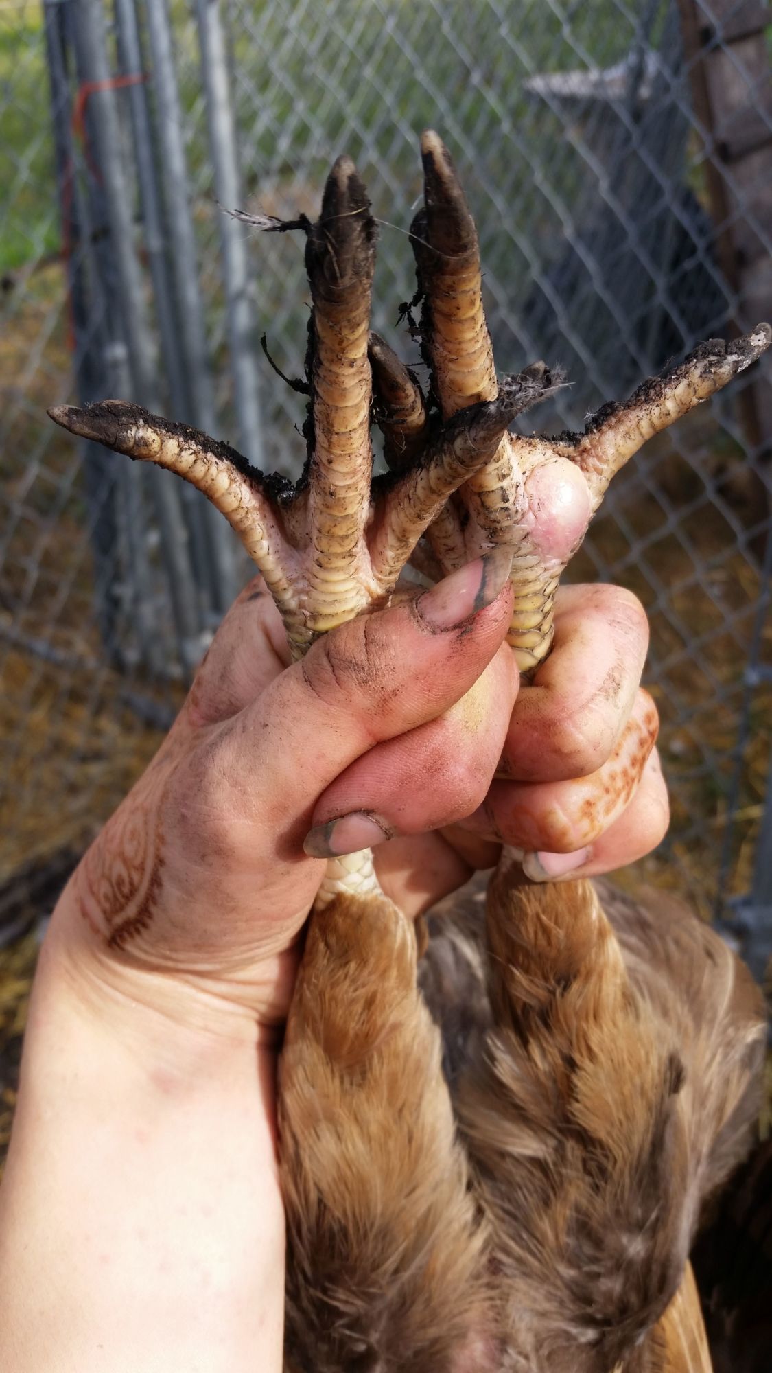 I have a one and a half year old brown leghorn hen who has a tumor or cyst-like swelling between her toes on her left leg. She does not appear to be limping and she's still laying, and doesn't show any signs of pain when I apply pressure to the area. I'm not sure how long this was developing, as I was gone on vacation for over a week and just got back last night. Since she isn't limping and I don't handle her very often, it may have been developing for a while. I just need advice on whether or not I should be concerned and should do something about this.