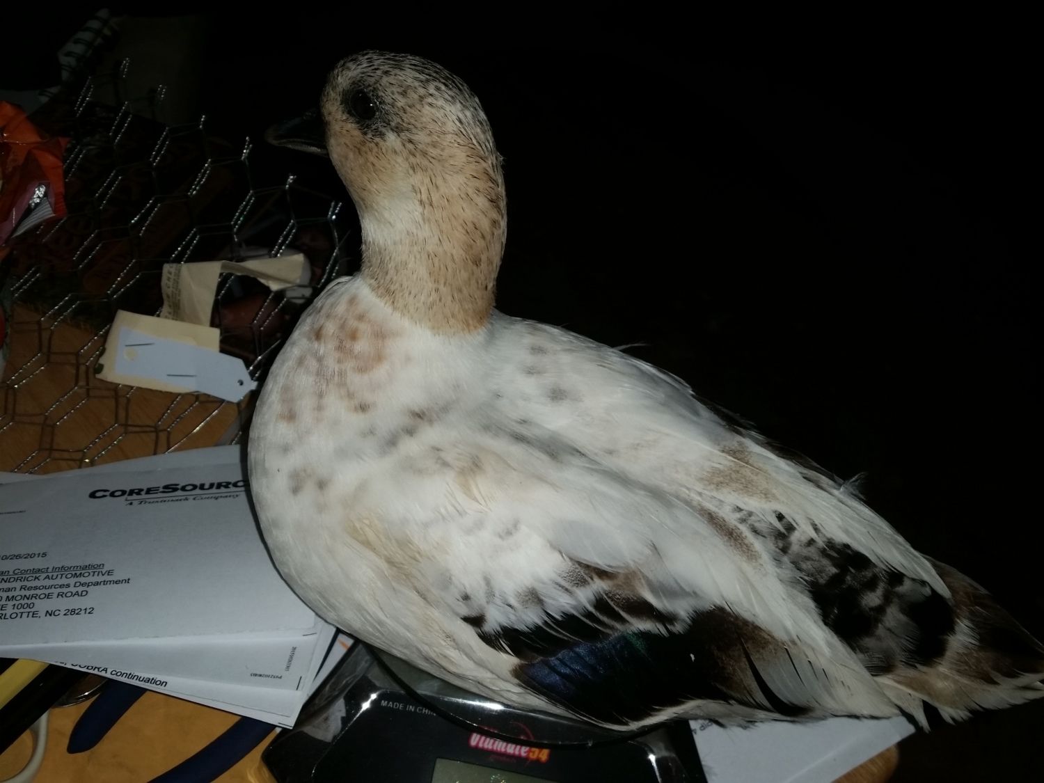 Got another cutie for you... young Snowy that hasn't started laying yet... she protests very vocally about being handled, but sits on a scale like a statue, lol...