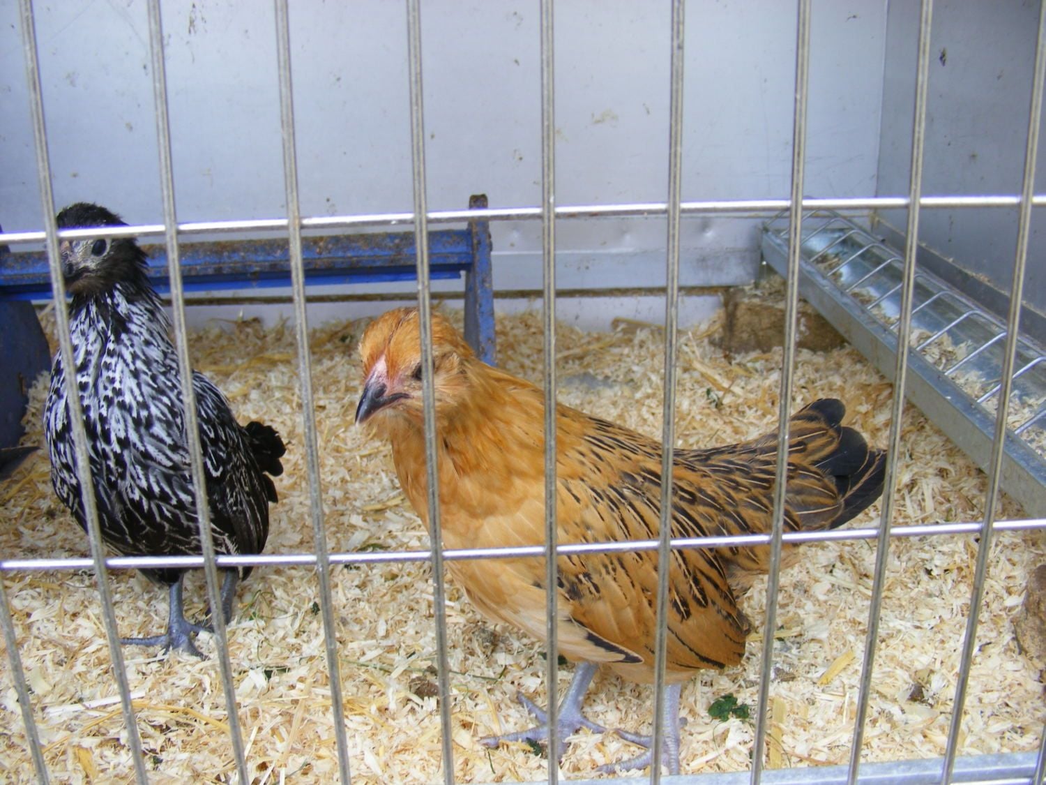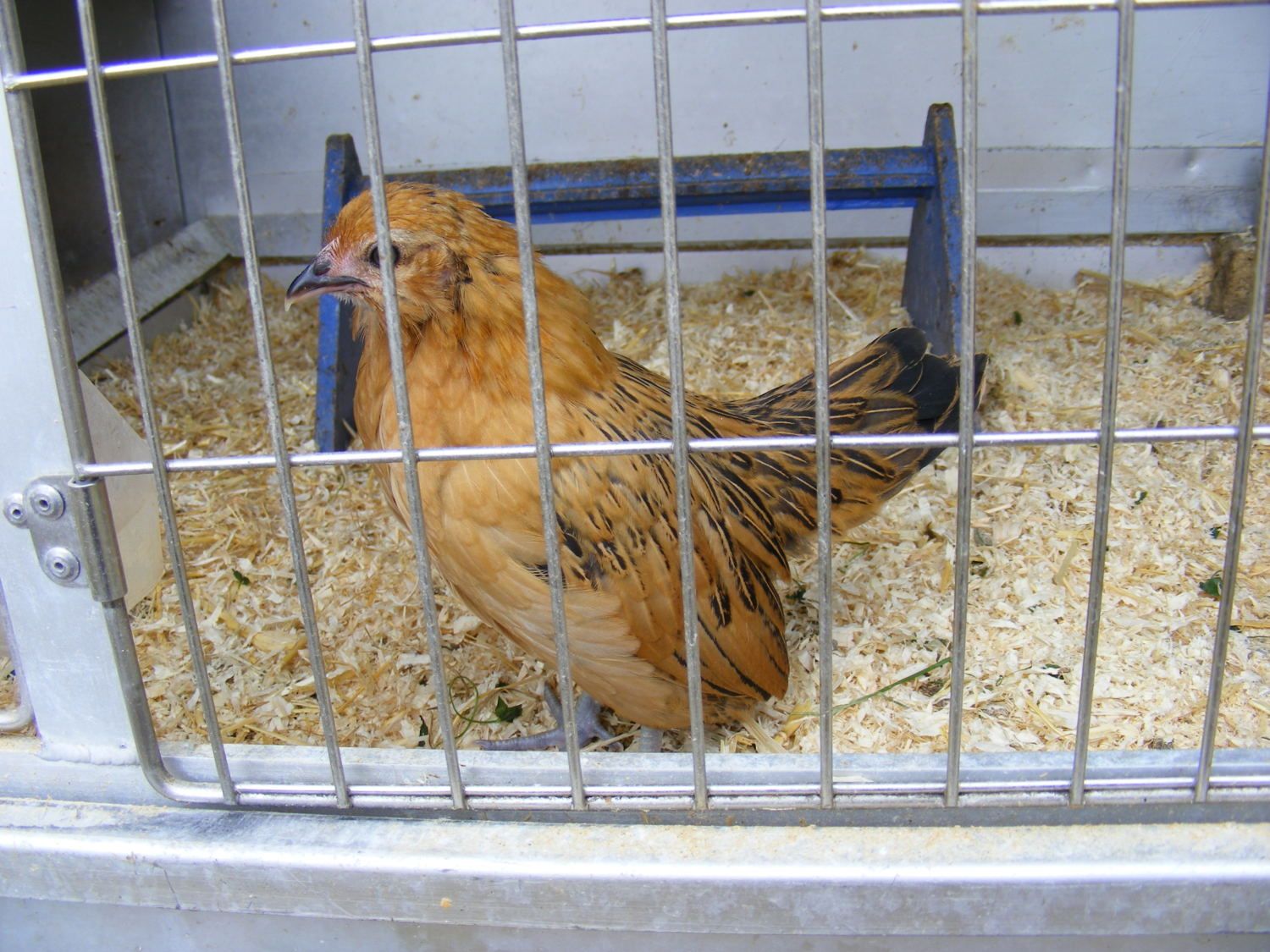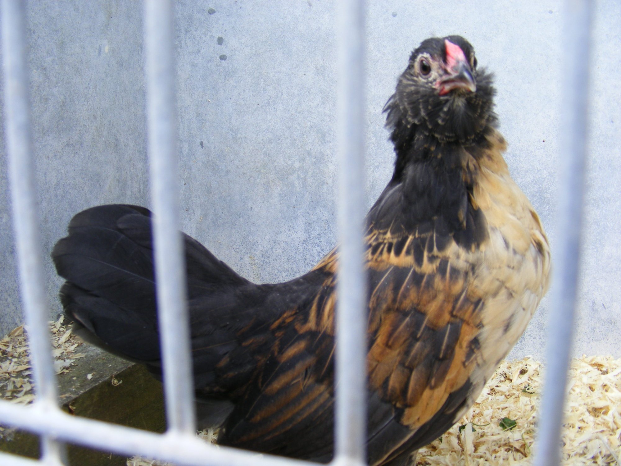 Mille Fleur roo, ? may be a BBR or Ginger roo, Buff Columbian Roo, Mille Fleur roo, Black pullet, tail of a Buff Columbian pullet and a Mille Fleur pullet.