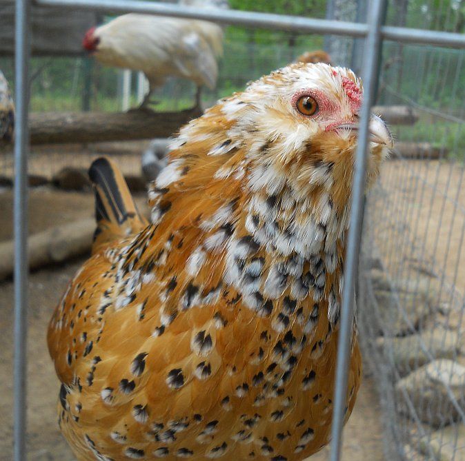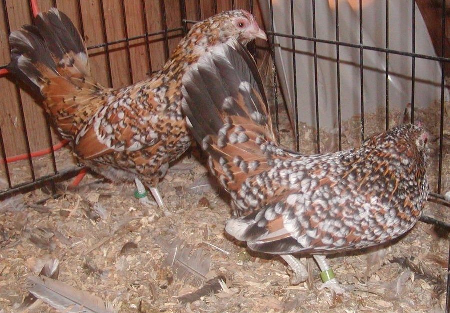 I recently acquired a couple of Mille Fleur d'Anver cross hens from a local lady who was trying to breed the color from scratch (i.e. taking the color from OEG). She was getting rid of them due to her own health reasons. She called them "project birds". These were the best two in her flock, I'd say she did a pretty good job. I can't let all of her work go to waste, so I took them and I will see about setting up a breeding pen for them. She's so close, all that's really left to do is put the slate back in the legs and refine type a bit. Here they are: