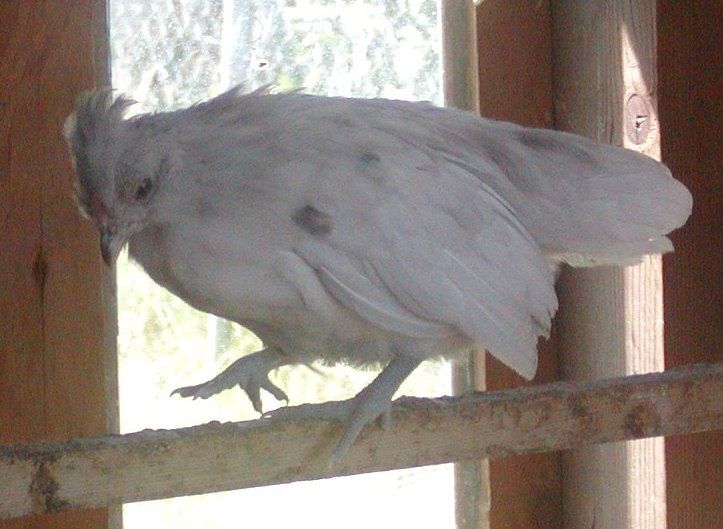 KristenR...the daddy is a Mille d'Anver roo straight from Aubrey's eggs (he formerly lived with Speckledhen but I stole his affection on a visit and had to go back and get him...she was mean to him you see and he was forced to flog her in defense *snicker*)...the girls in his pen are all d"uccles which is where the skin and leg feathers come from (recall I am creating the hairy legged horde to infilitrate JJ's flock). There are 2 porcelain d'Uccle girls in the pen and they are naturally eliminated because they are my two and half year old hens which have two seasons of breeding behind them..proven porcelain. The other two girls are a Lavender d'Uccle and a Black split to Lavender d'Uccle. It is possible that there is a silver gene in one of those girls because they were sired by a Mille d'Uccle that I did not breed here as he was a purchased replacement roo after the death of my porcelain roo. I did have one Columbian d'Uccle thrown last year by the Mille d'Uccle roo so it could simply be a throw back from the chick's grandfather if he was the silver carrier.