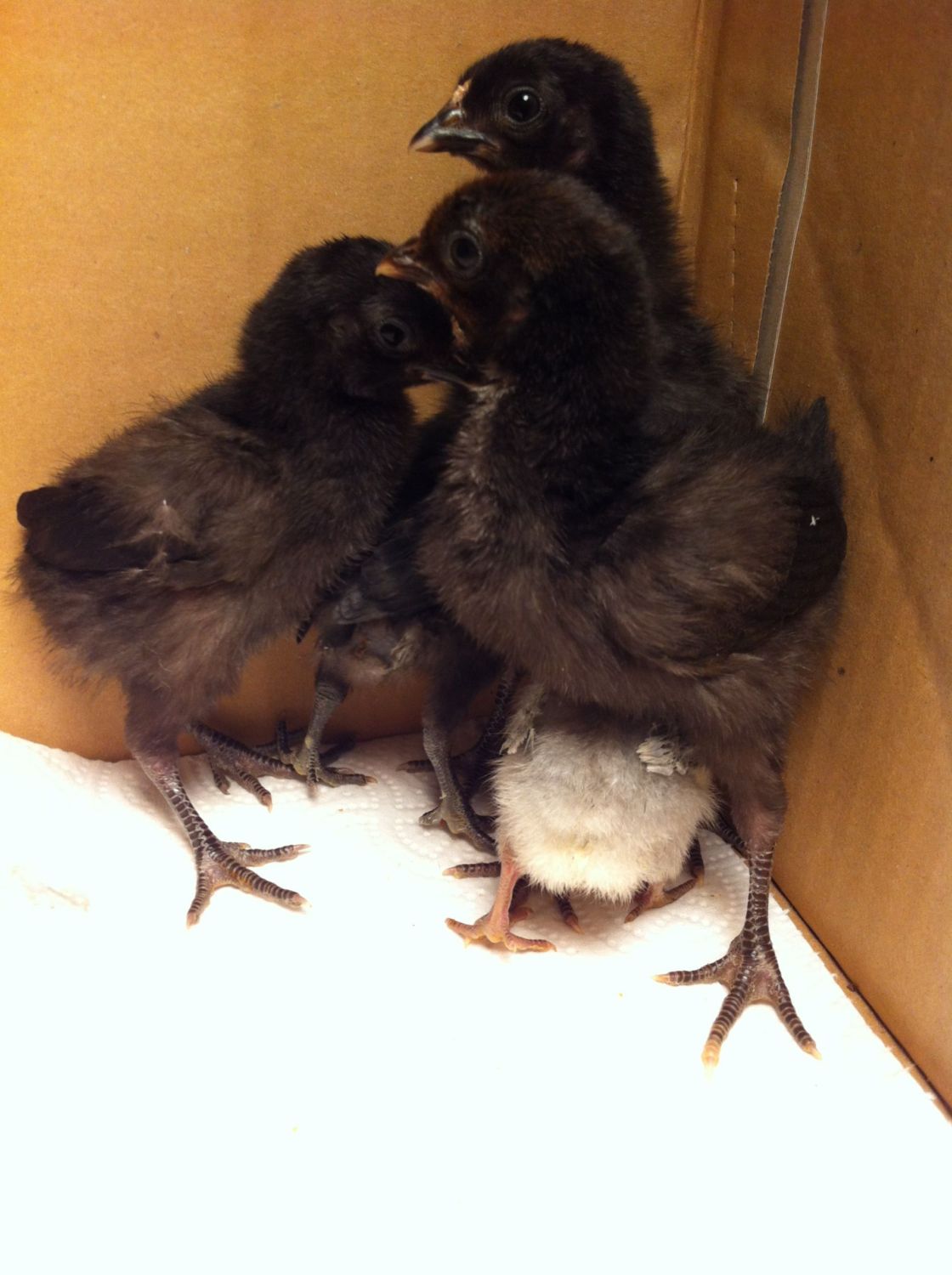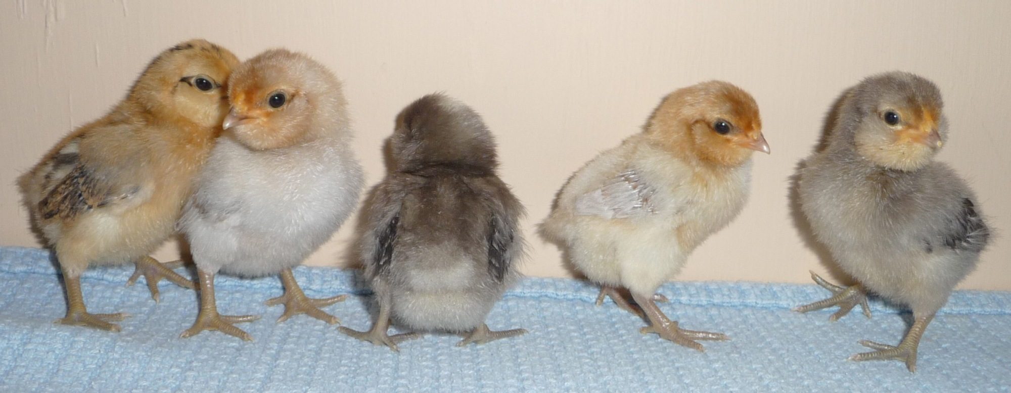 Just thought I'd share a pic of my little tiny Self Blue chick trying to hide under the Moderns. She is about 1/2 the size of a normal d'Anvers chick. My line seems to thrown these pretty regularly. I have another, older small one that hatched about a month ago. I had one hatch in last year's chicks as well. I wonder if they are throwbacks to something used to make the variety?