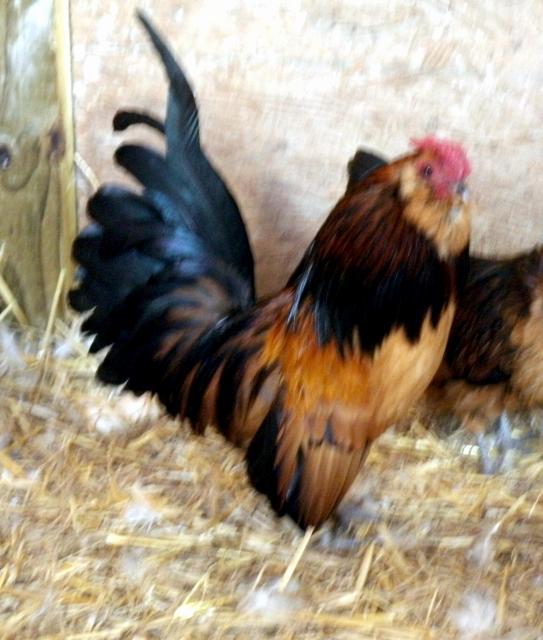 A better view of Elmer's wing feathers, hinting at him NOT being a Columbian Wyandotte, but rather a mille fleur jumbo d'Anvers!