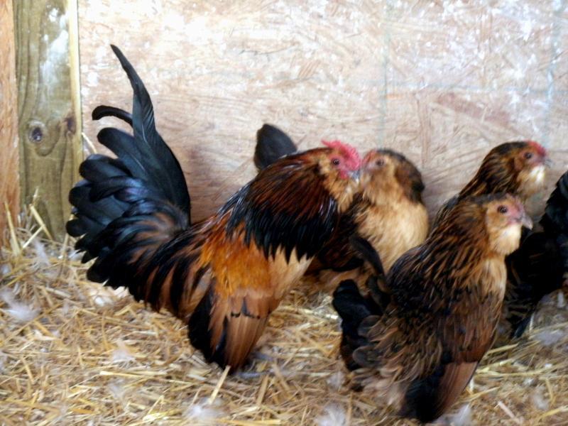 pale mille fleur with a lot of white. (Think he'll turn out like the European photos of Lemon milles?) He is HUGE, fearless, and friendly, friendly, friendly! We think he's a roo, because his feet are gargantuan, and he's so large and bold. (Watch him turn out to be a big, bossy hen!