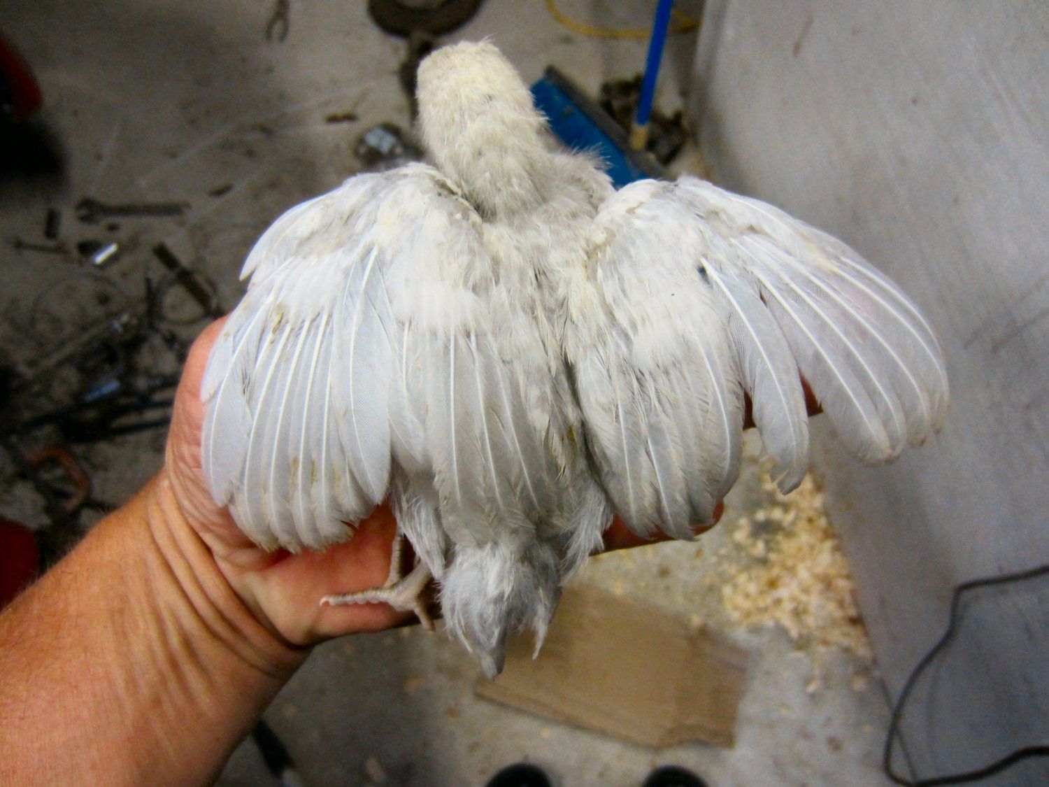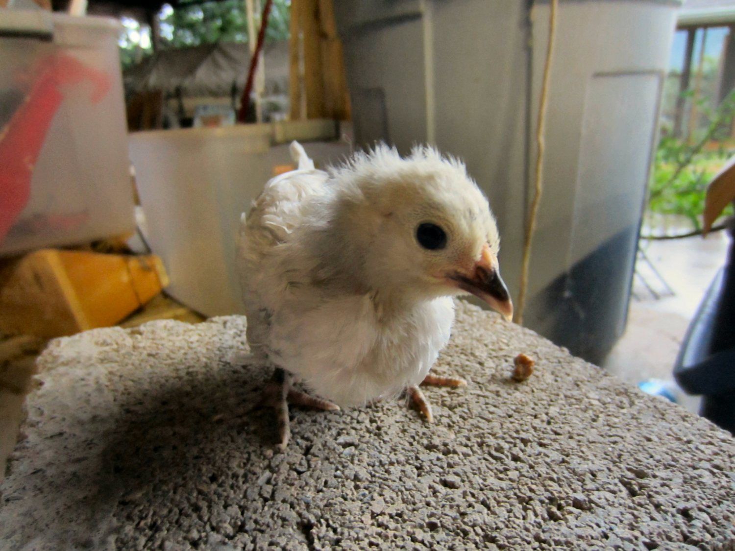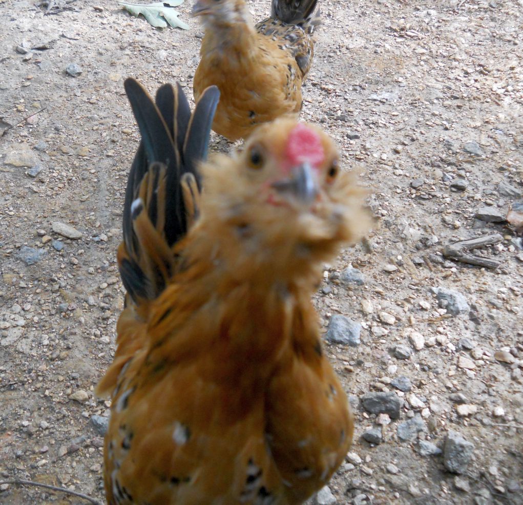 The 10 week old D'Anver male is becoming my good buddy-thinking he must be Spike's kid, I swear. He has feathers on the legs from mama Aimee, a flattish comb, but he is the sweetest thing alive right now, comes tearing across the yard like a little speedboat when I come down the steps, lets me pick him up, chatters to me. The little pullet with him is a ditzy as Lucy was, maybe even more. She's precious and clean legged and someone needs her for breeding, but so far, no bites on my ad for all of them.