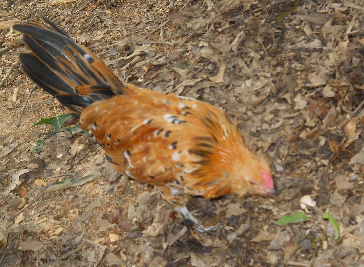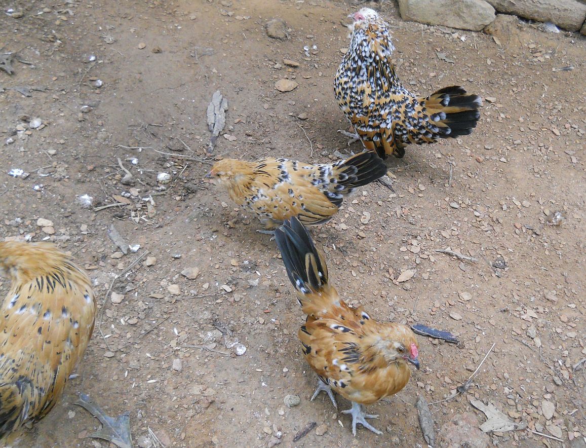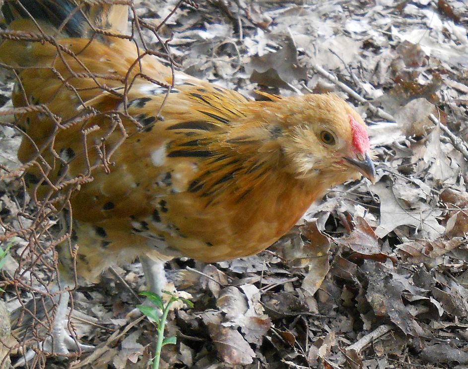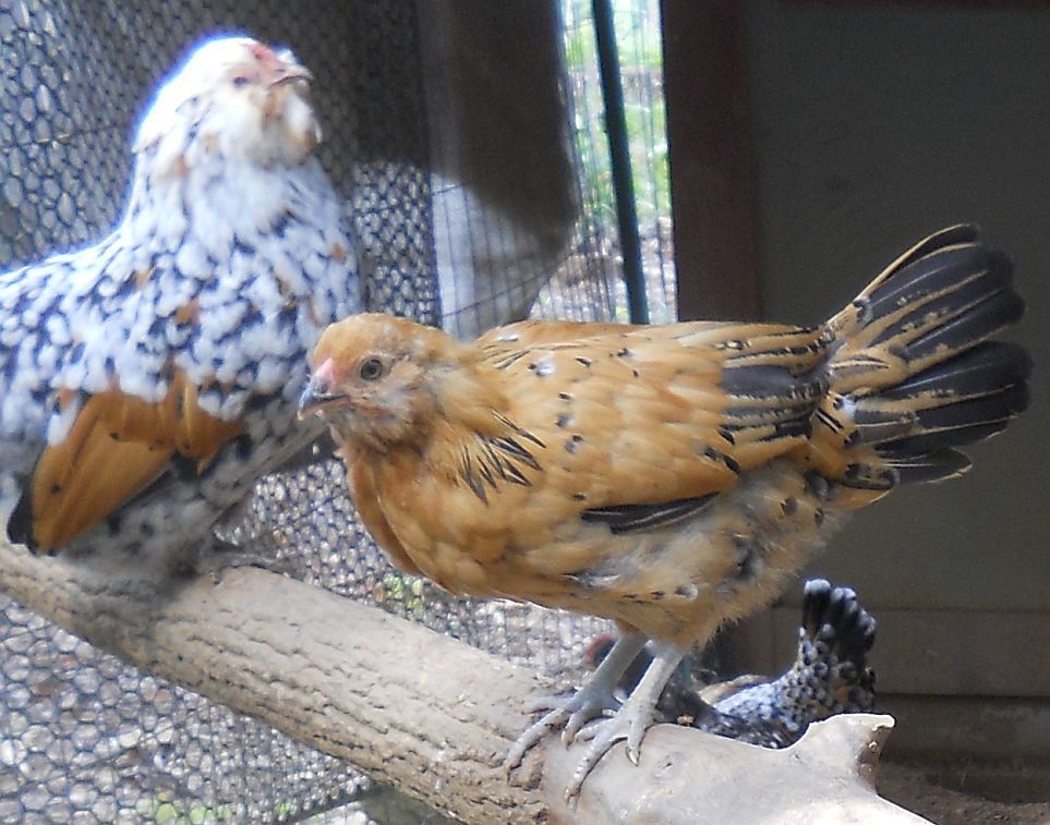 Aimee is still a pullet producer, producing 6 pullets out of 8 chicks. Both males and one female have feather stubs, but the other five are clean legged as far as I can tell-they are skittish, having been raised by broodies in the bantam coop with my two LF Dellie X chicks. Thought I'd lose the smallest pullet to cocci, though I'd never lost one to that before, but my DH took her on as a project, brought her into the house, fed her special food and Corid water with raw honey in it and darn it, if that little thing isn't better and finally growing and thriving. Guess we'll keep her since she may never reach full size. She's noticeably smaller than her sister that hatched with her.