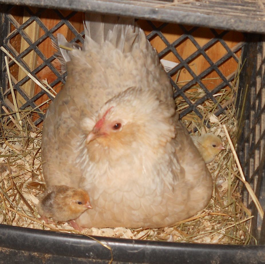 Oh, Maura has two of the three chicks hatched, both hers. One is porcelain and one is mille. Now, the mille has to belong to Spike, my mille rooster, right, since Aubrey is porcelain and Maura is porcelain? Though, Maura's mother is Mina, who is a mille, but 1/2 porcelain. The last one is Mina's chick and the egg is pipped.