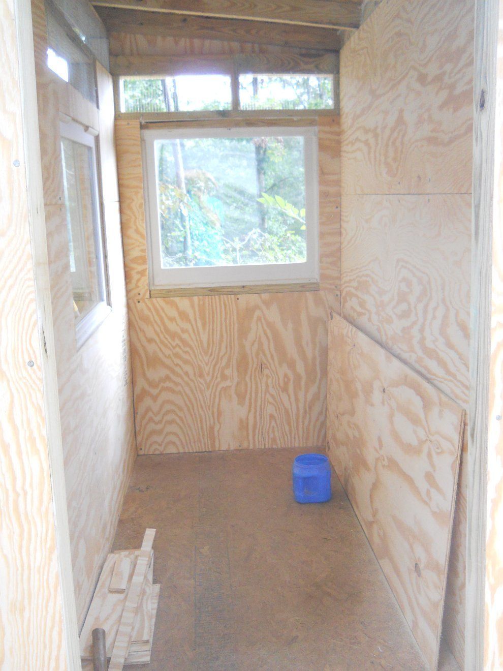 My back will recover, I'm sure, but thank you! Atlas and his two girls are in the new coop tonight though the front isn't painted and the trim isn't on yet, but he hurt Caroline today and this needed to happen. So, here is the inside of their new temporary home, soon to be the bantams new home.