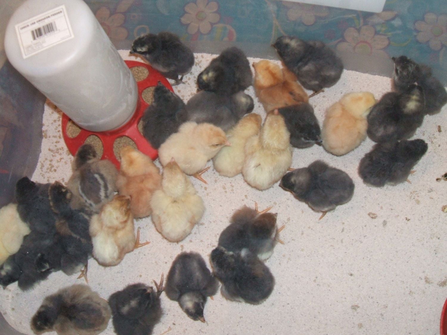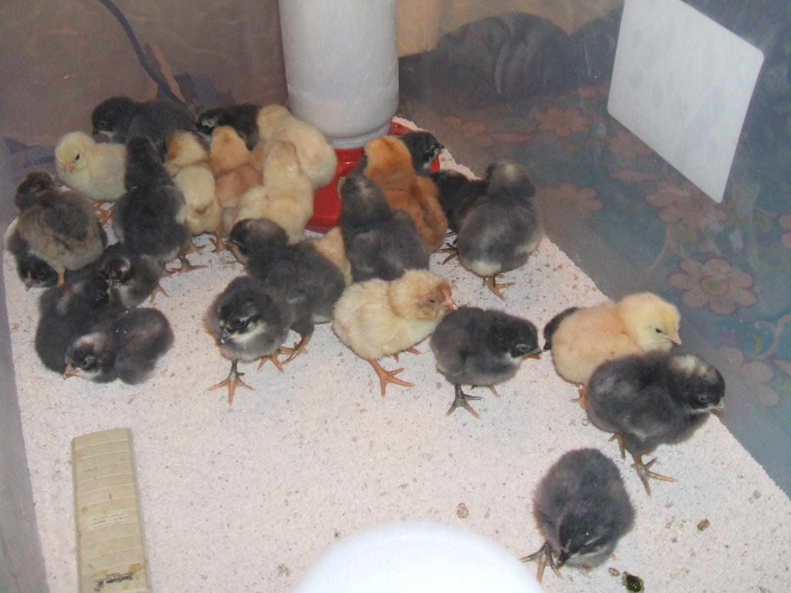 Here are the chicks, the yellow ones are off the Amberlink hens and the rest are off the White Rocks.