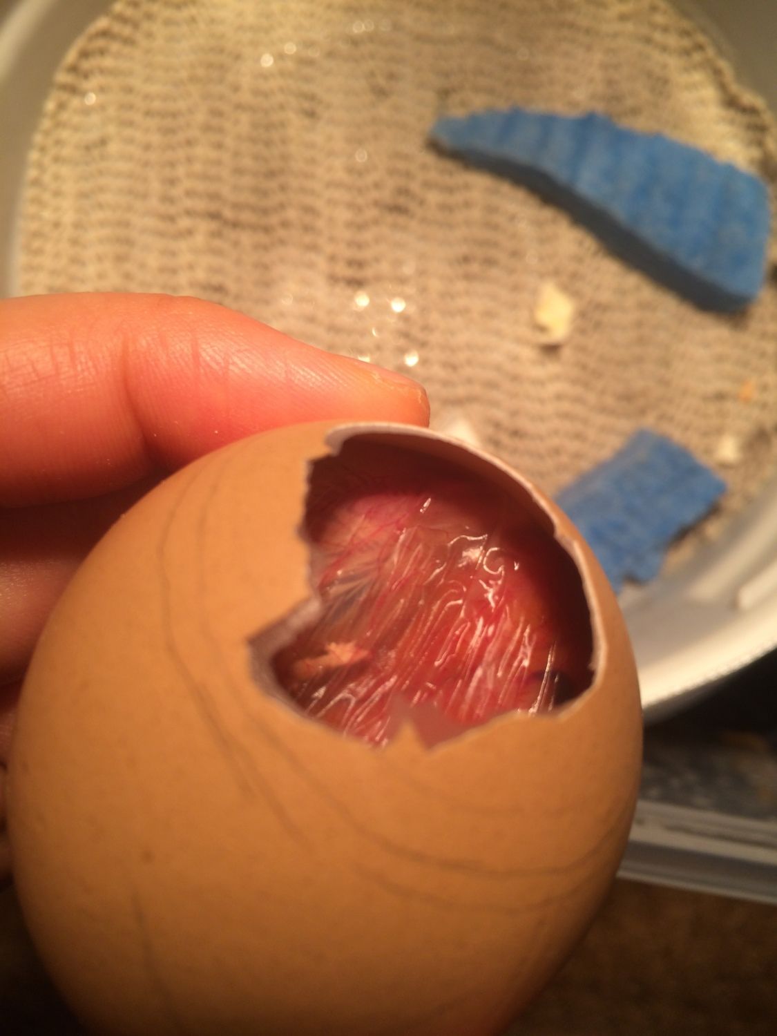 I can see veins. I can also see what looks like a really thick vein, like a clot of blood. The chick hasn't moved since Day 21 (no wiggling eggs). So I waited and chipped away the shell today. There's a yolk sac, still.
