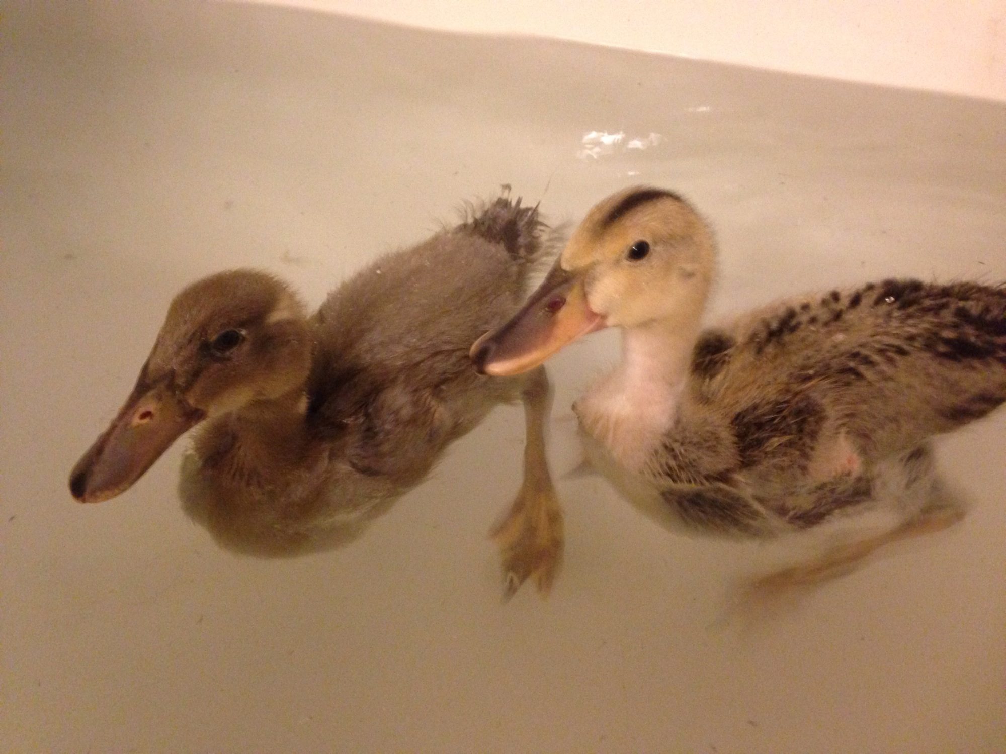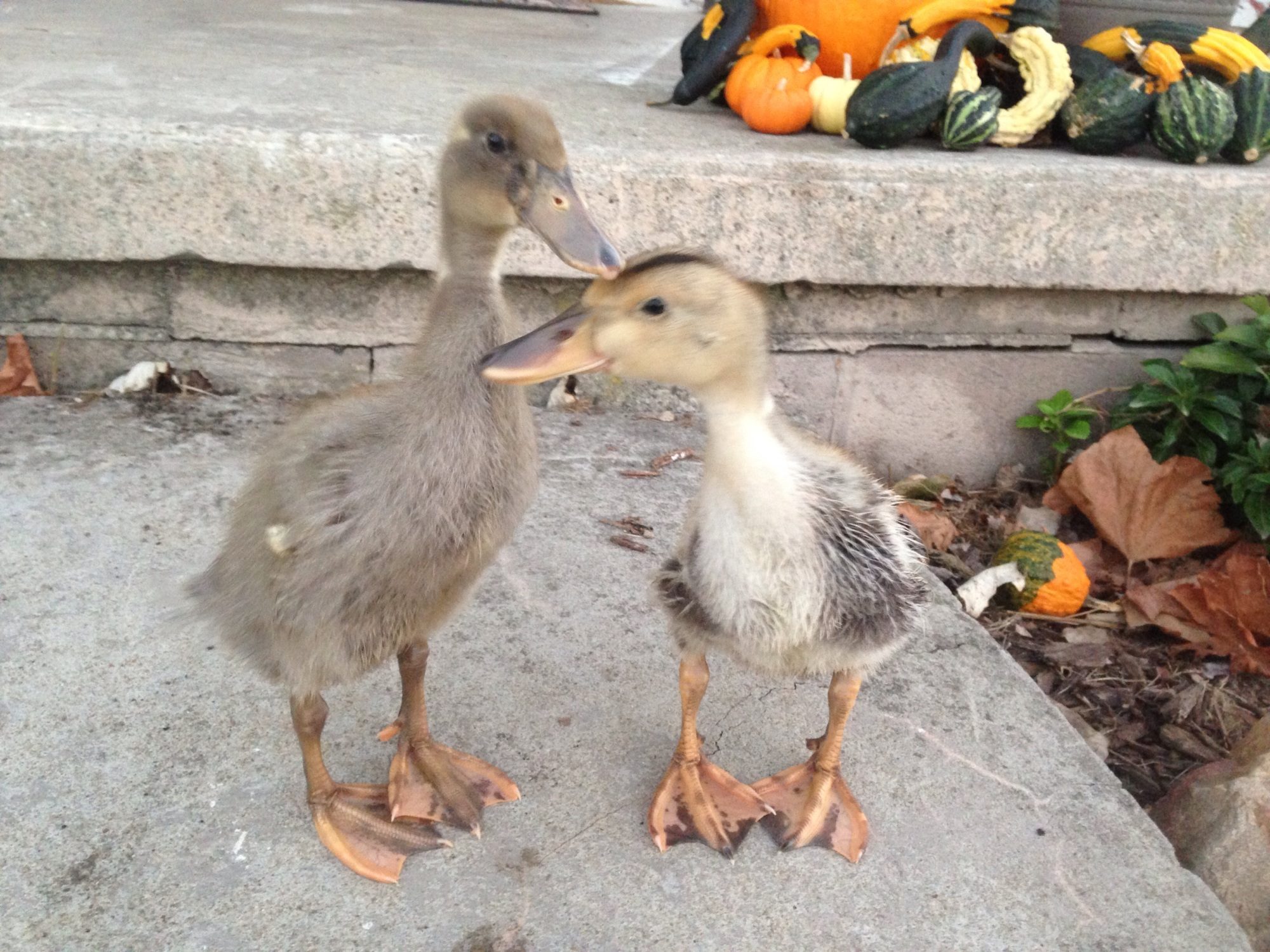 They are beautiful and you did an amazing job with them. You would never know the problems they had by looking at them now.Update: Snowflake and Dickie are almost three weeks old and healthy. You would never know by looking at them that they both had such a rough start. Dickie is definitely a runner mix. Almost 100% sure he's a from my fawn/white runner girl and mallard drake. He stands straight and has an elongated downturned bill, much like a runner. Snowflake is turning dark, which makes me think WH. Most likely from my WH girl and mallard drake, but could also be from my WH drake and a different female. She makes a constant noise through her nares when she lays down as she starts to get sleepy, but otherwise seems fine. And I have PICTURES!