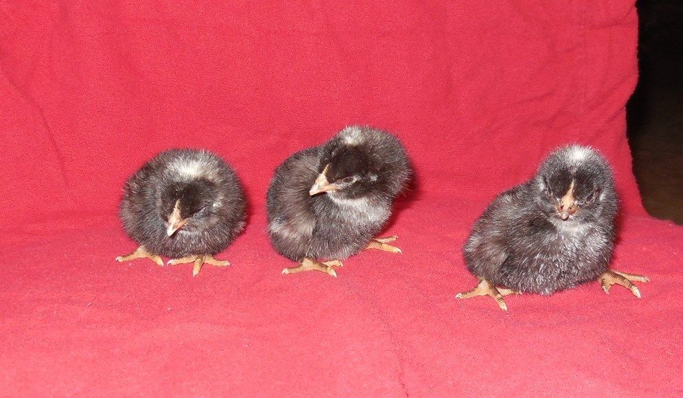 Is it possible they could be sex-linked? The smallest black chick has no white spot on his head, the other two blacks both have white spots :hu
