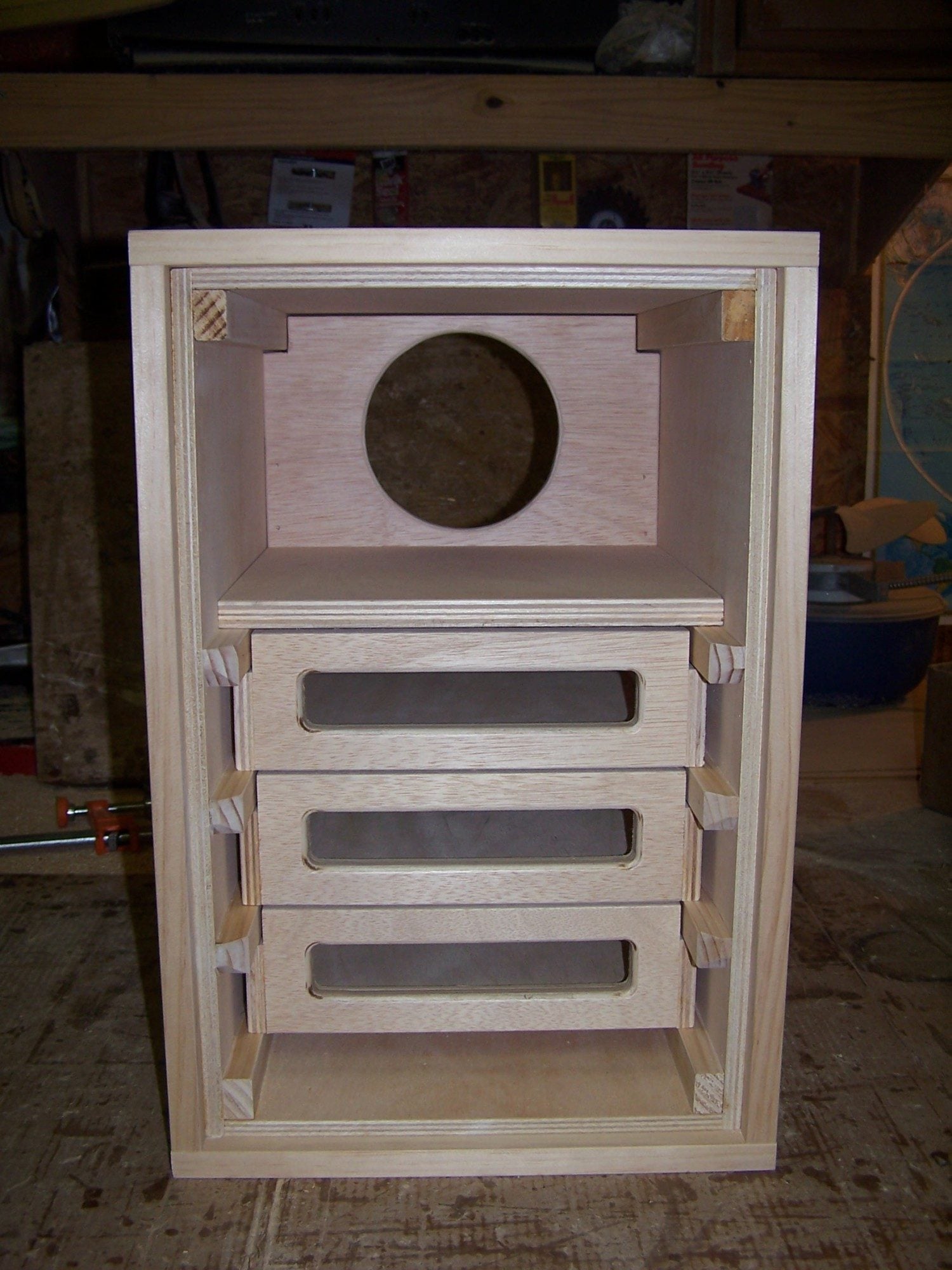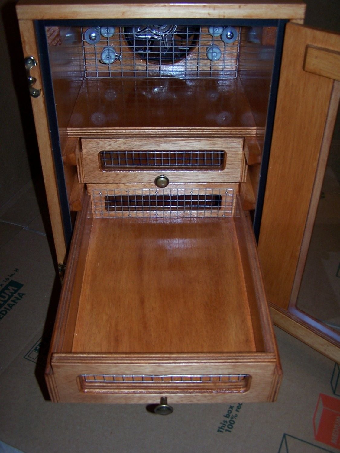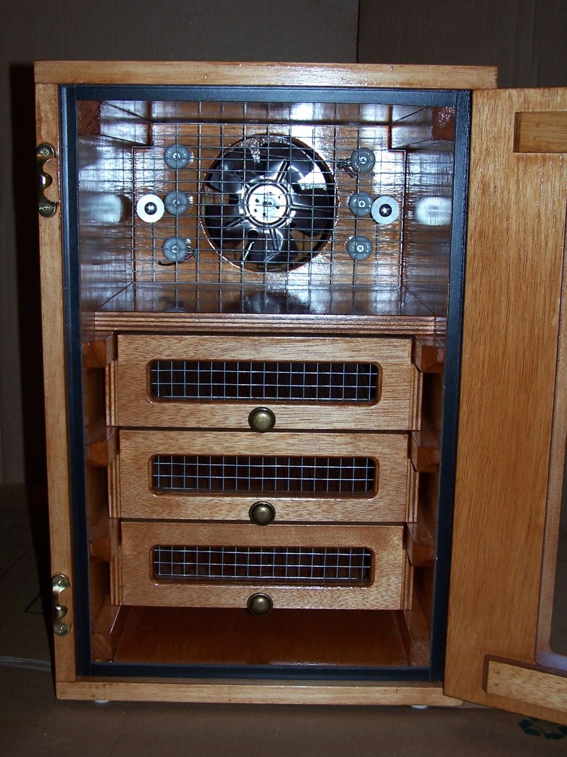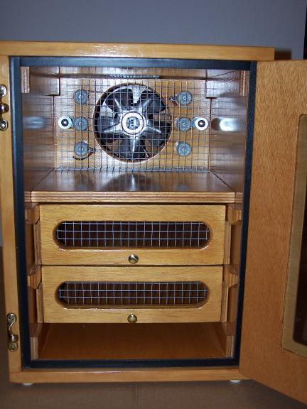 The two heat elements have separate redundant controls. Both water trays are filled from above the cabinet. One is fed by a gallon glass jug working on vacuum.