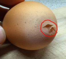 One of my three Brown Bovans (production chicken) laid this strange looking egg this morning. I adopted these Bovans as one year olds in May 2014, so she is about 1 1/2 years old. She didn't lay an egg yesterday, which didn't worry me because she's been taking a day off every week or so during October. I figure it is due to shorter days this time of year (I'm in Wisconsin) and growing in new feathers. The deformity at the tip of the egg is soft, but the rest of the shell is hard. Nothing leaks out of the deformed end, so the part that looks a little 'dented-in" is actually solid. There just seems to be an extra swirl of softer shell at the end. For example, if I touch the very tip of the extra material I can move it a little. The hen has been healthy and acting normally. I don't see any signs of infectious bronchitis, though she was sneezing a few times a day about three weeks ago. No nasal discharge, however, or other signs of illness. They have a separate dish of oyster shells and I feed them layer feed. I also sprinkle a very small amount of finely ground up egg shells on top of their feed. I've never had any broken eggs or evidence of eating eggs. As you can see in the second picture, the coloring on the egg is lighter at the ends. I did move their little pre-fab coop within a new run I built on the side of our garage, but that was back on September 8 (now November 2), and they didn't miss a beat as far as laying. They are not at all crowded, but the new run doesn't get much sun, and their previous location did offer afternoon sun.