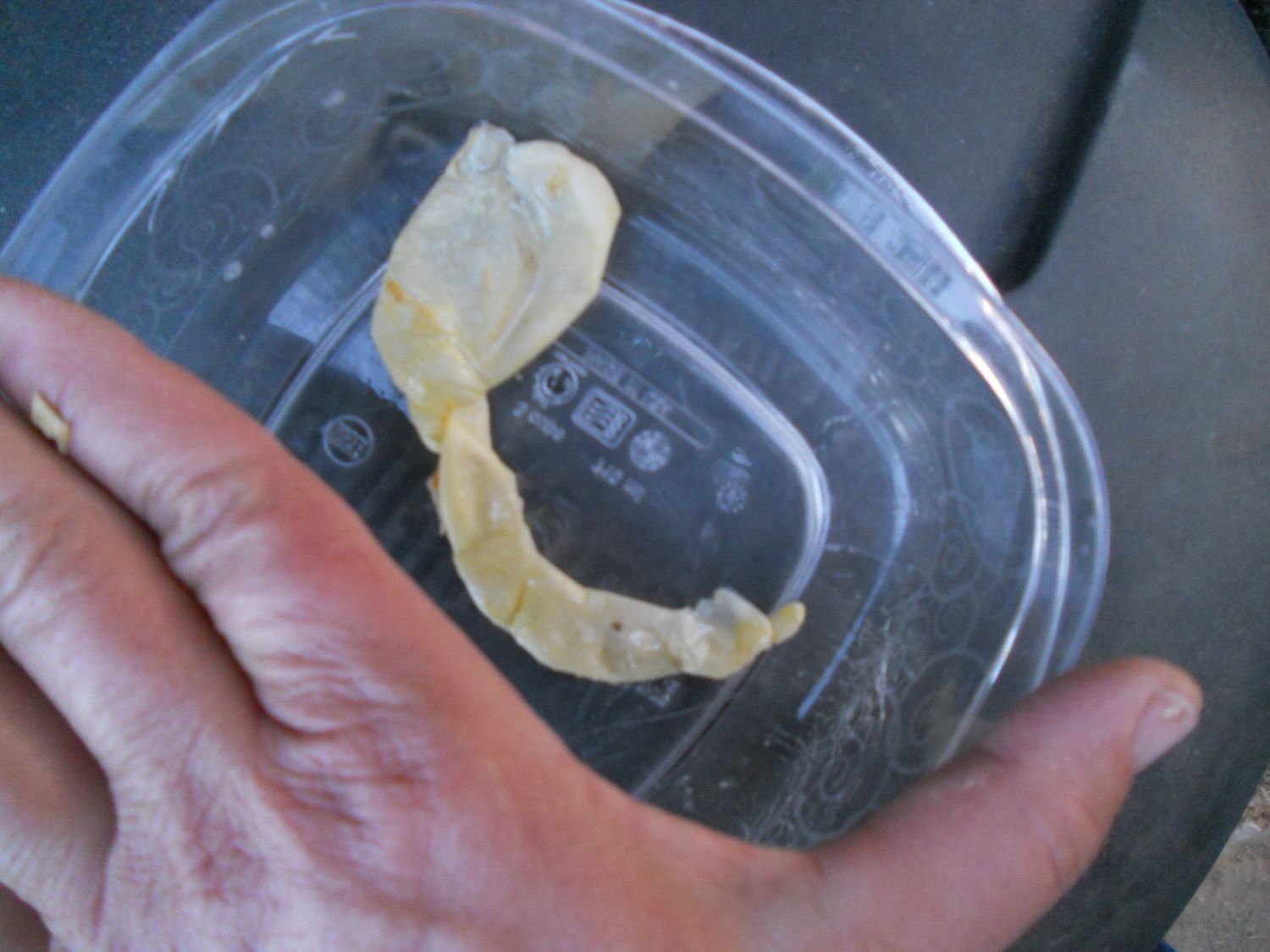 YIKES!!! I found one of my hens acting egg bound late this afternoon. Did the warm bath thing and then remembered calcium. I gave her a teaspoon of dolomite powder in a bit of yogurt and about an hour later this thing came out. I caught her eating it and managed to get it away from her. It was mostly egg white with traces of yolk , not sure how much yolk she ate, It looks like the membrane was caught in the oviduct and pulled into this weird shape.