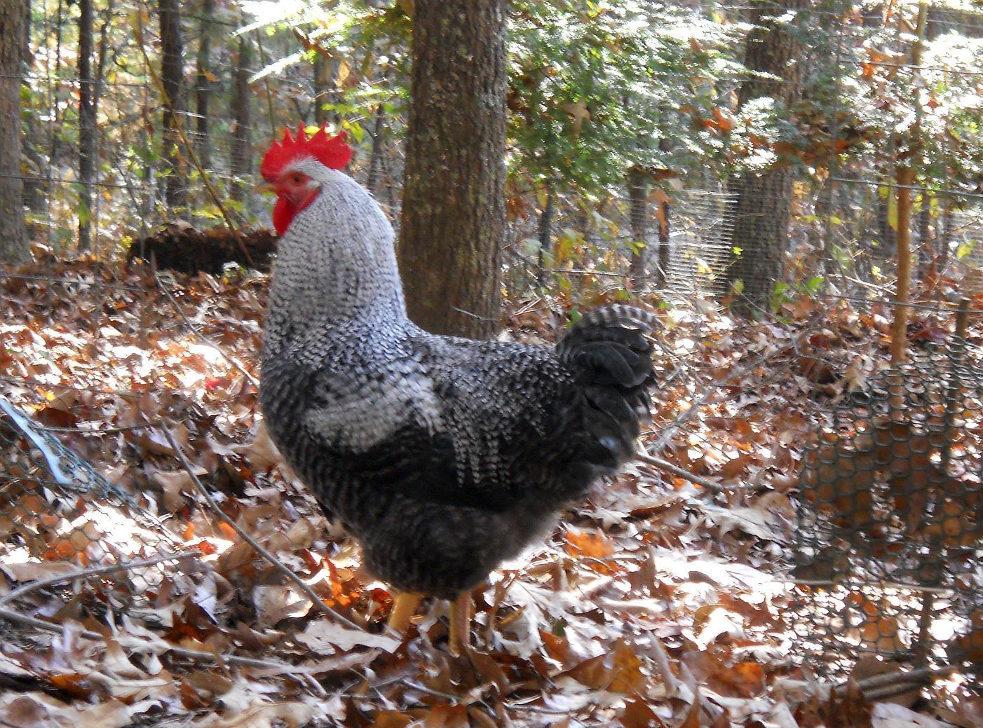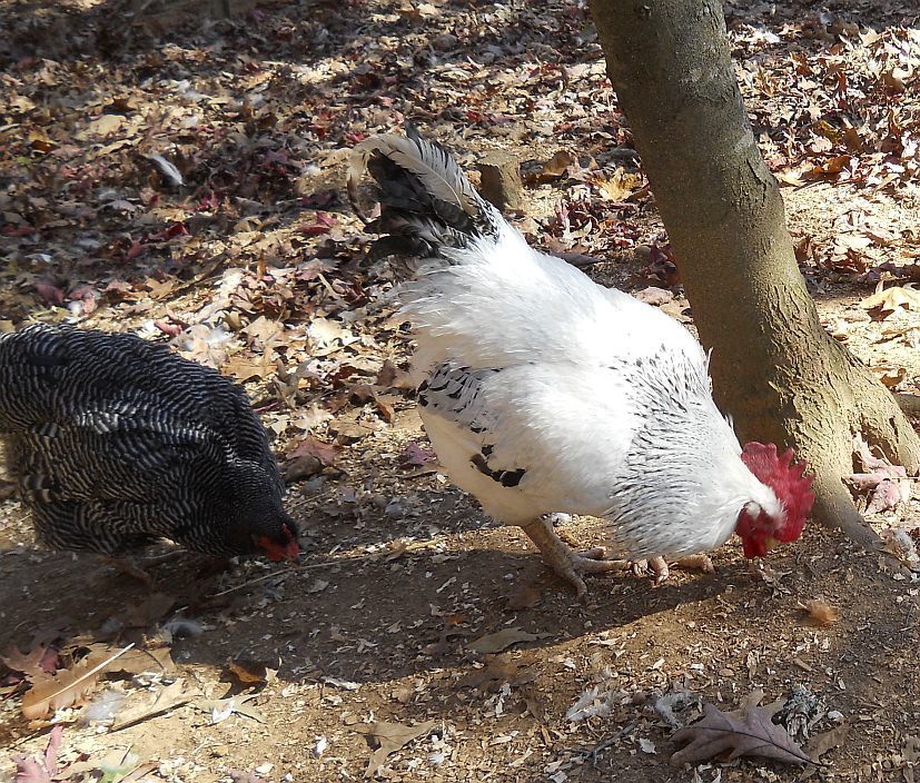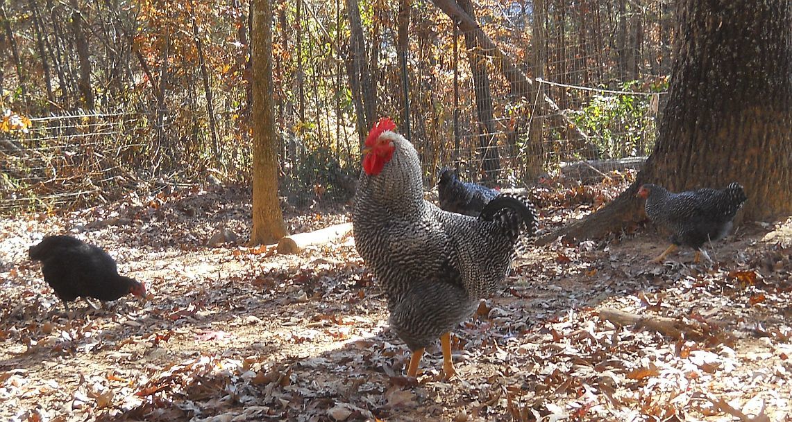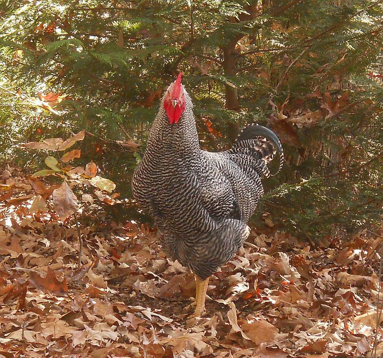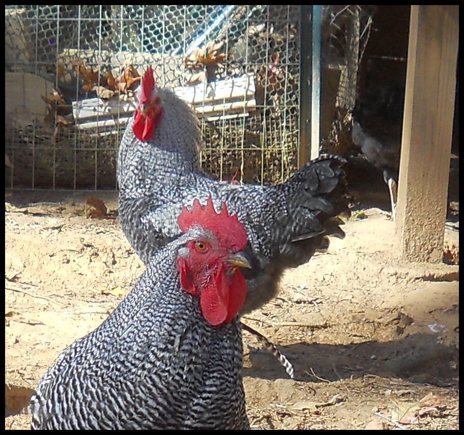 Indy has the first notch on his belt as my new up and coming flock leader. He just thwarted a fox attack. I was inside at my computer while they free ranged when I heard his booming deep alarm calls. He sounded extremely disturbed so I ran outside onto the deck to see what was wrong. He and younger brother, Ira, were standing on the bank in front of a row of Leyland Cypress trees inside our fence, which abuts the power line easement road. On that road was a gray fox. Even seeing us, he didn't immediately vamoose into the woods across the road, like he was weighing his options. I saw Isaac trucking across the yard, taking one group of hens to the coop, but Indy and Ira stood their ground with the small entourage they were guarding until DH got out there with his rifle. Then, on command to "Run home, Indy! Take the girls home!", he and Ira and the girls who had been hanging with them all ran up the hill and across the property to the main pen.