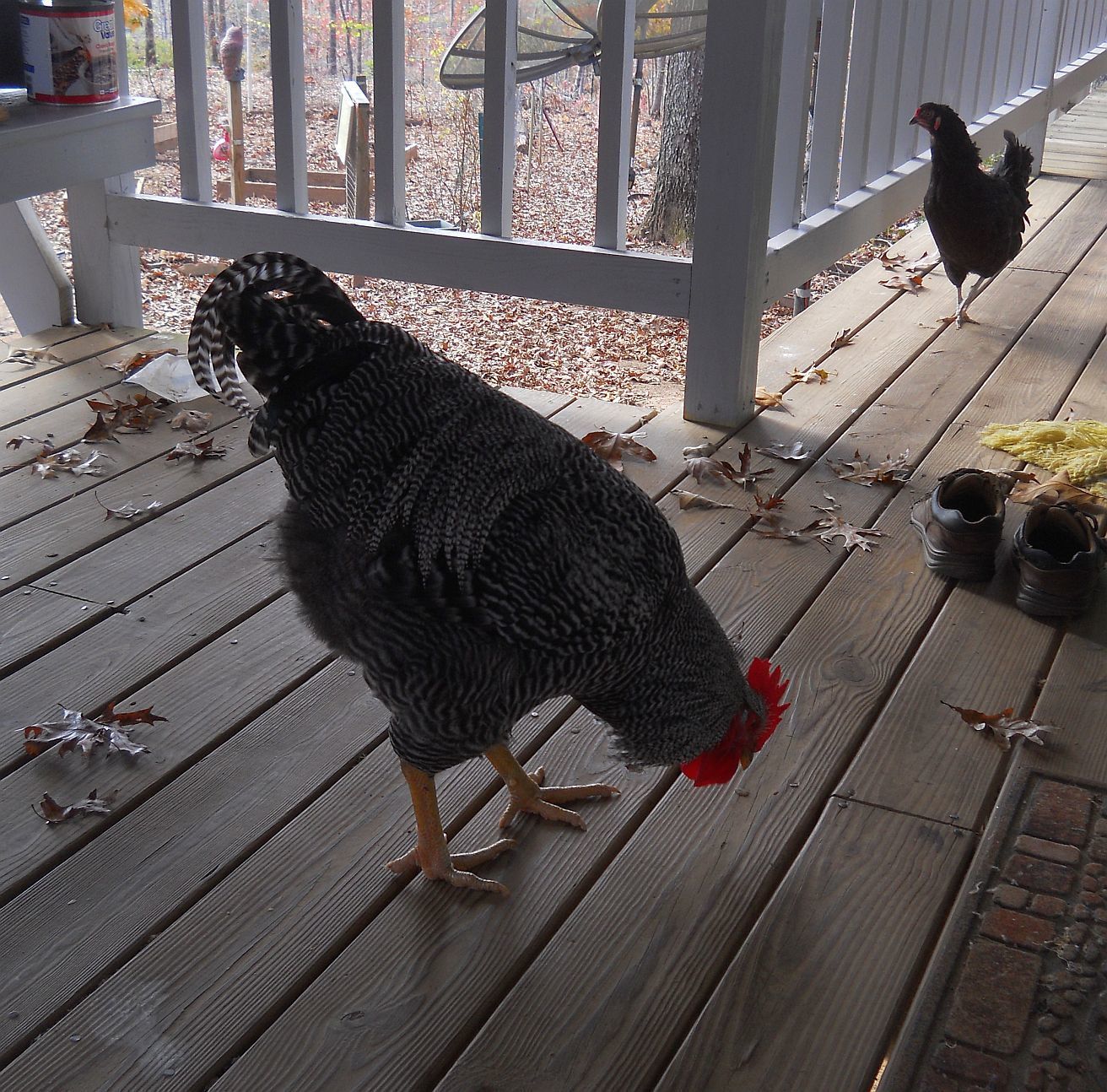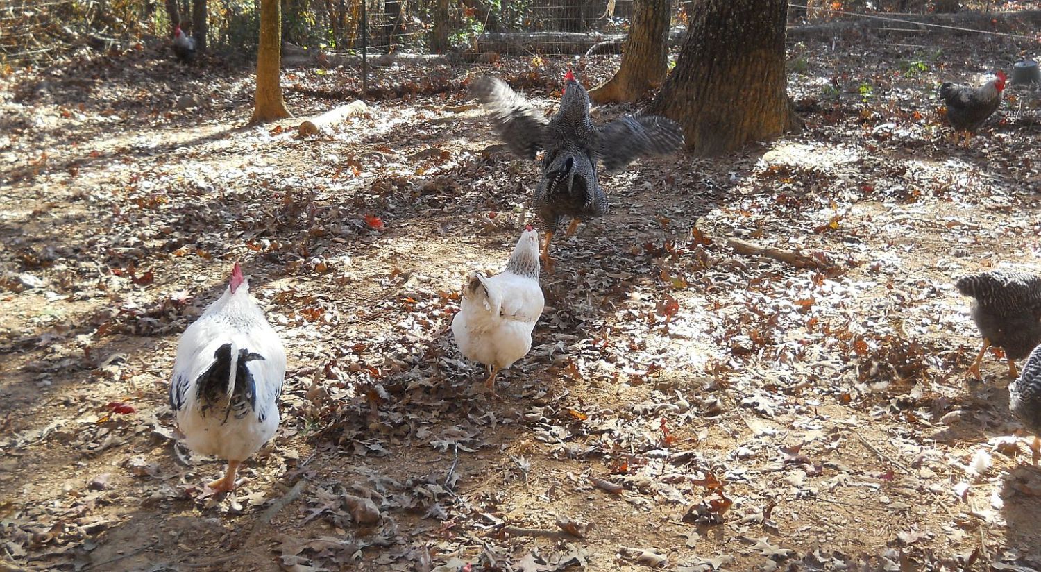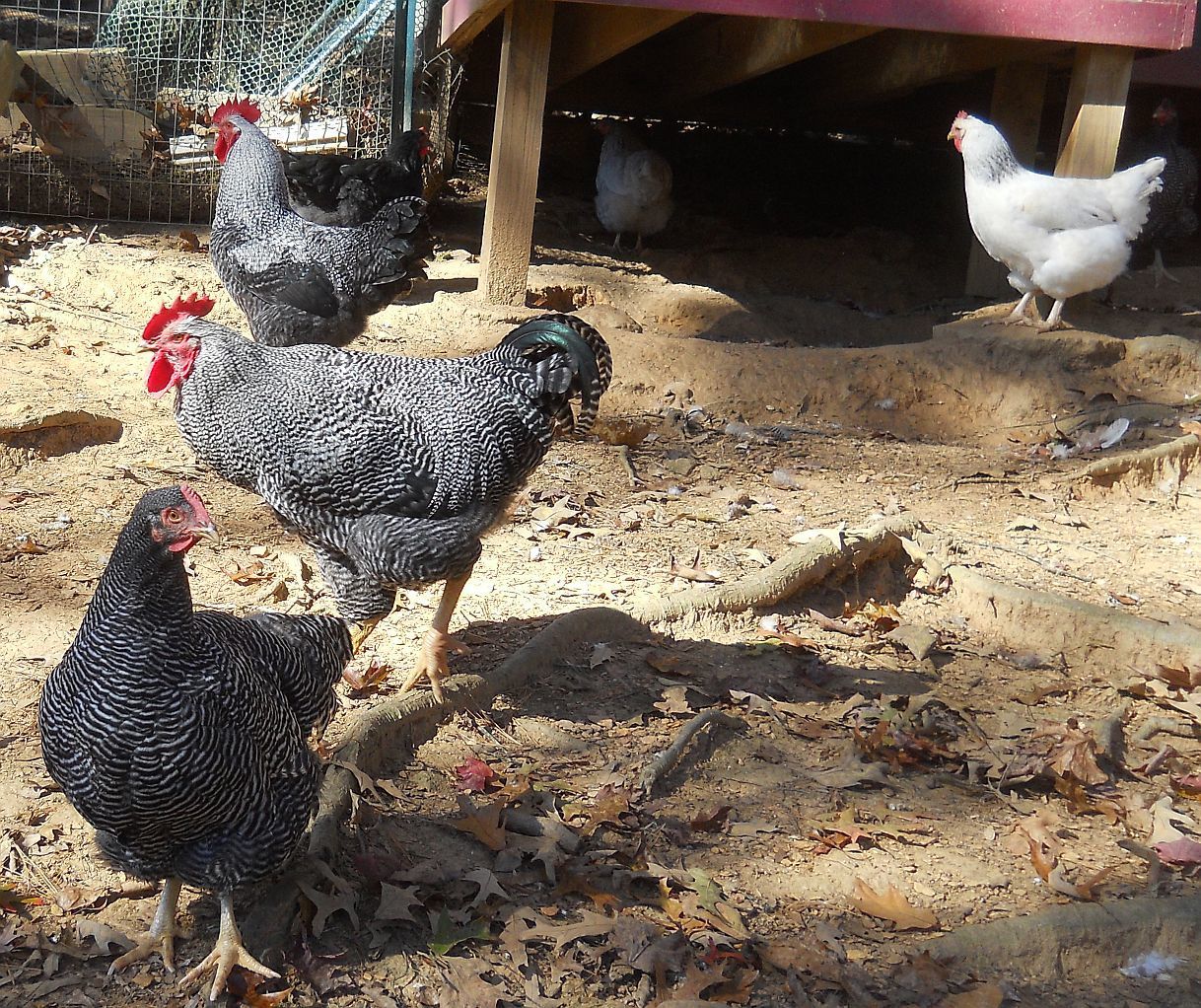Indy has the first notch on his belt as my new up and coming flock leader. He just thwarted a fox attack. I was inside at my computer while they free ranged when I heard his booming deep alarm calls. He sounded extremely disturbed so I ran outside onto the deck to see what was wrong. He and younger brother, Ira, were standing on the bank in front of a row of Leyland Cypress trees inside our fence, which abuts the power line easement road. On that road was a gray fox. Even seeing us, he didn't immediately vamoose into the woods across the road, like he was weighing his options. I saw Isaac trucking across the yard, taking one group of hens to the coop, but Indy and Ira stood their ground with the small entourage they were guarding until DH got out there with his rifle. Then, on command to "Run home, Indy! Take the girls home!", he and Ira and the girls who had been hanging with them all ran up the hill and across the property to the main pen.