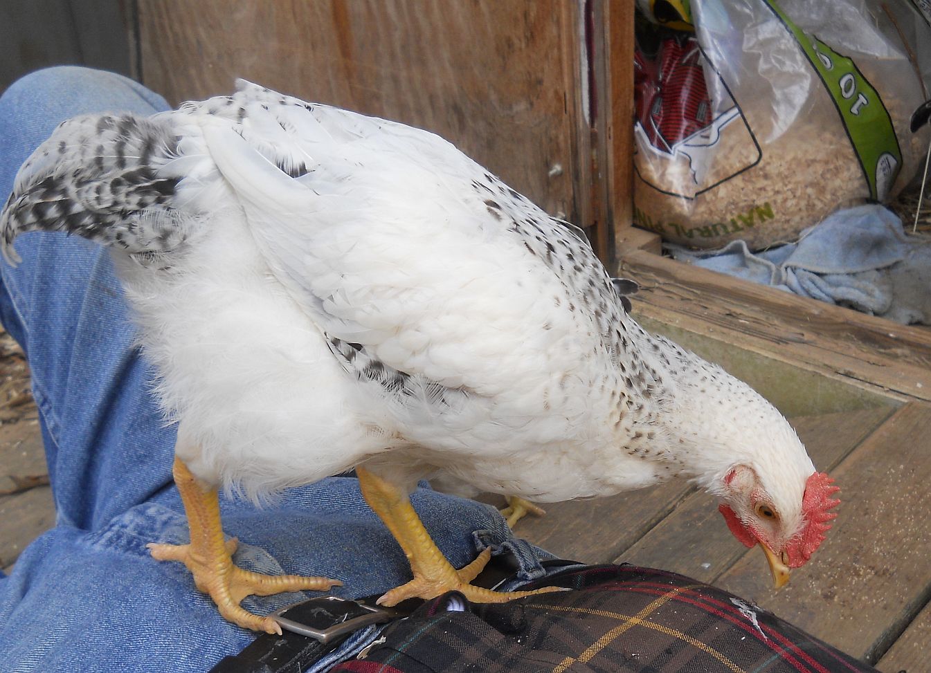 Deacon is a sweetheart, though his body type isn't what I envisioned for the flock. Still, there is an upside to that--he won't be too heavy for the hens. And I have two younger sons of Isaac coming along. One looks like a Delaware and the other is a Delawegger, so pea comb and beard/muffs. I say all this to point out that I have too many roosters around here for the main flock to put up with the antics of a stupid rooster.