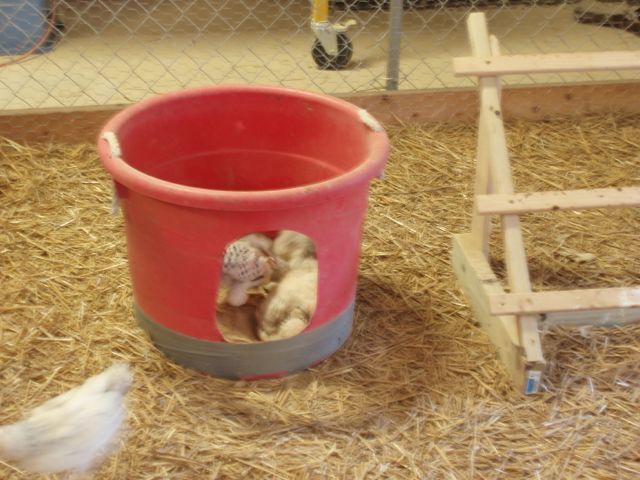 Mine are still huddling in corner of pen at night but are some times sitting on roost during day.
