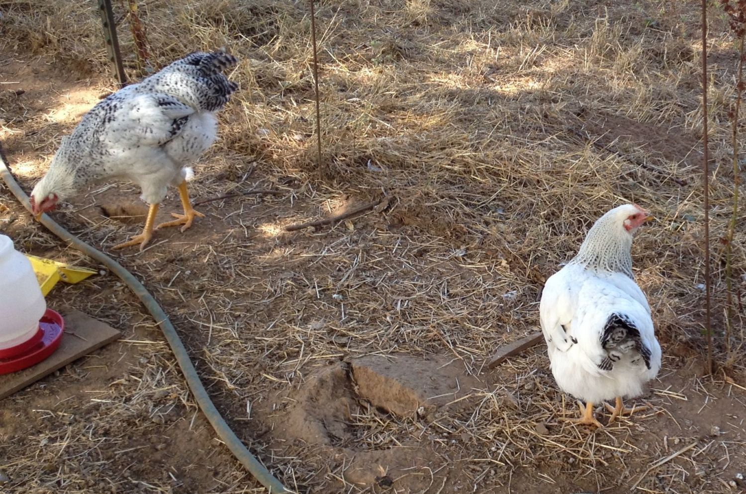 These two photos show the parents, who are molting. Dad (who isn't in a hard molt -- he is just missing some of his tail) but still has his tail up in the air; and one of the two Moms (who looks like she needs a molting telathon). You can see some of the older pullets are getting to be nearly her size, though she is a bit downsized at the moment.